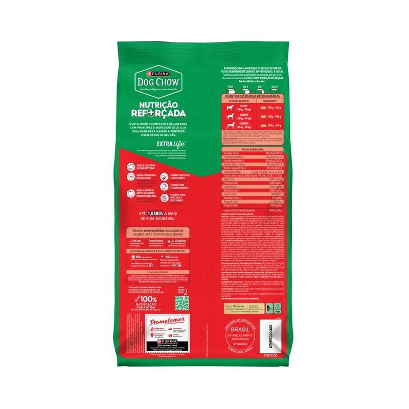 Dog Chow® Nutrição Reforçada para Adultos Médios e Grandes é um alimento completo e balanceado, com EXTRAlife® , uma combinação especialmente desenvolvida de antioxidantes, vitaminas e minerais que ajuda a prevenir a oxidação das moléculas no corpo, retardando os sinais de envelhecimento e protegendo-o, dia após dia. Também conta com proteínas e ingredientes de alta qualidade para ajudar a proteger o a saúde e o bem-estar do seu cão. Juntos Protegemos o que Importa.