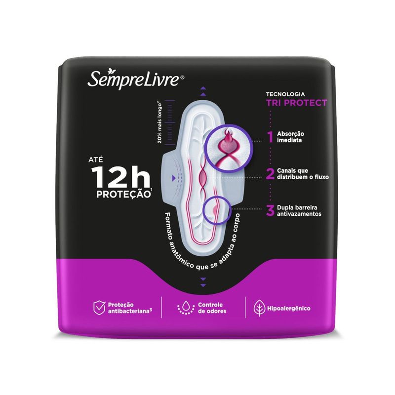 Sempre Livre® Conforto Noturno é um absorvente higiênico que garante até 10 horas de proteção contra vazamentos. Possui a tecnologia TRI PROTECT, que oferece ABSORÇÃO IMEDIATA, CANAIS QUE DISTRIBUEM O FLUXO e DUPLA BARREIRA ANTIVAZAMENTO.