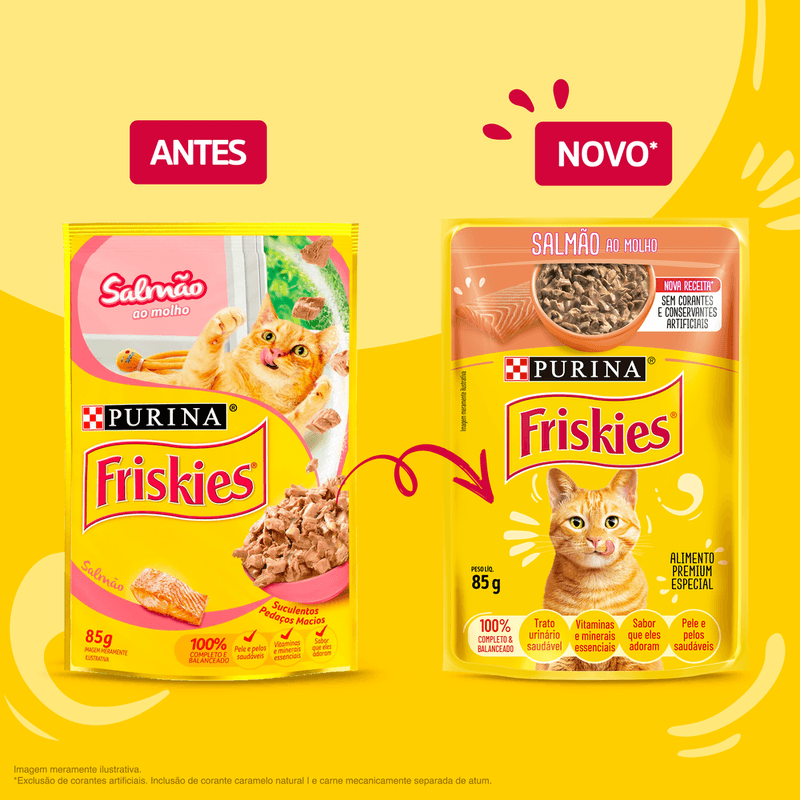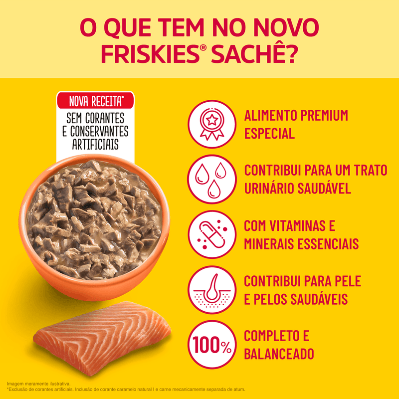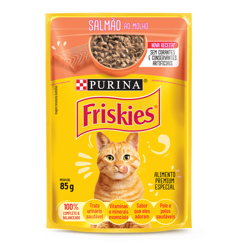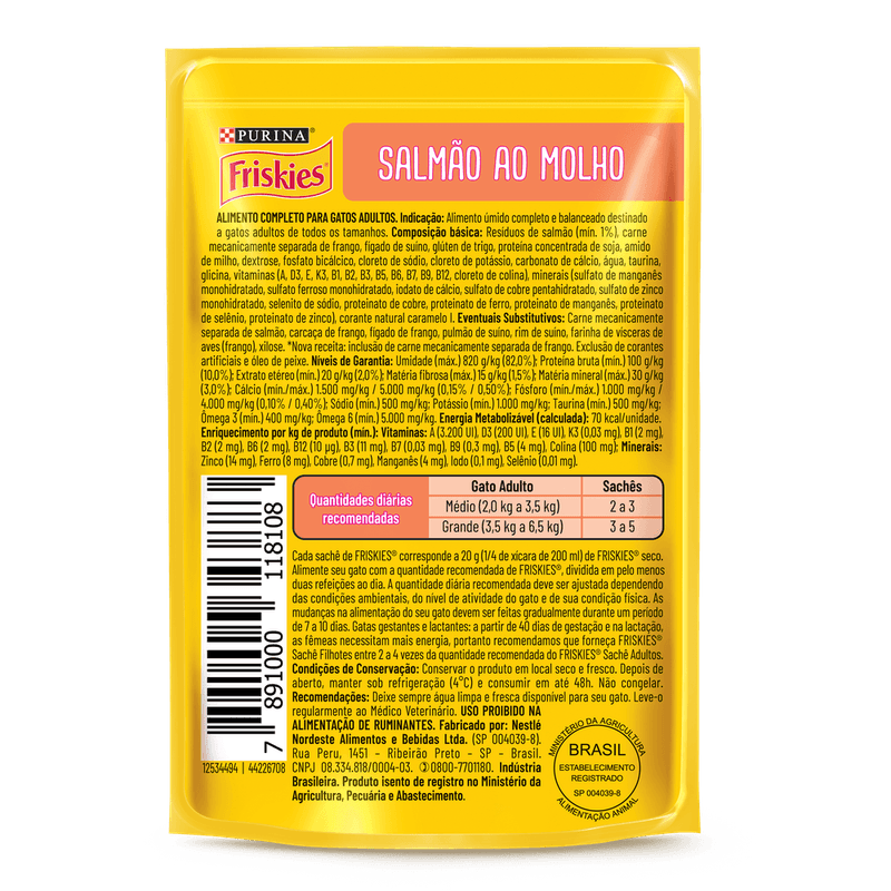 FRISKIES® Salmão ao molho é um alimento úmido completo e balanceado destinado a gatos adultos de atividade normal. Pele e pelos saudáveis graças aos níveis adequados de zinco e ácidos graxos essenciais. Visão clara e saudável devido à adição de vitamina A e taurina. Formulado com vitaminas e minerais que auxiliam nas defesas naturais. Músculos fortes e saudáveis devido à presença de fontes de proteínas de alta qualidade. Para mais informações sobre o regulamento completo, acesse https://www.nestle.com.br/marcas/purina-friskies ou ligue para 0800-779-5500.