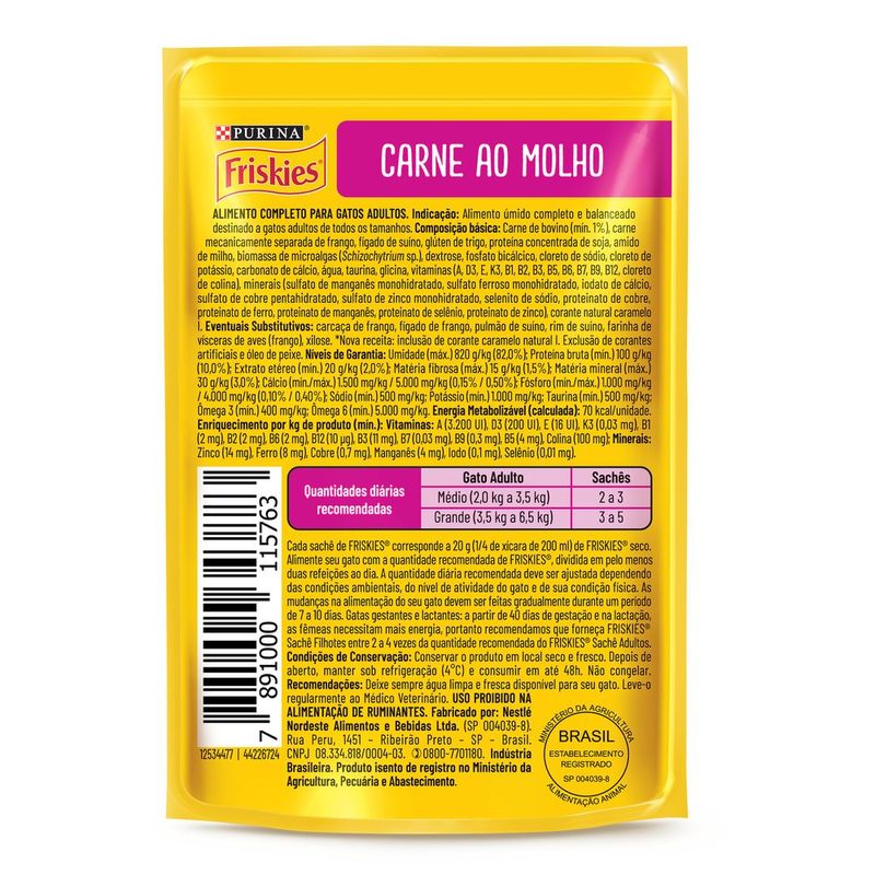 FRISKIES® Carne é um alimento úmido com sabor que os gatos adoram. É um alimento saboroso feito de pedaços com carne em um molho, sem corantes e conservantes artificiais. É um alimento premium especial, 100% completo e balanceado para gatos. Contribui para um trato urinário saudável e auxilia na hidratação diária. Ajuda a manter o seu gato saudável através da combinação de vitaminas e minerais essenciais. Contribui para pele e pelos saudáveis. Proteínas de alta qualidade que contribuem para manter músculos fortes. Para mais informações, acesse https://www.nestle.com.br/marcas/purina-friskies ou ligue para 0800-7701180.