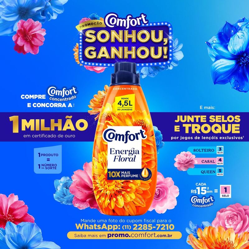 • O Amaciante Concentrado Comfort Energia Floral proporciona 10x mais perfume**, contém óleo de argan***** e cápsulas de perfume que garantem uma fragrância intensa e duradoura para suas roupas • O Amaciante Concentrado Comfort Energia Floral tem ótimo rendimento, menos de meia tampinha basta na sua lavagem*! Rende 6,7 Litros e 75 lavagens* • O Amaciante Concentrado Comfort Energia Floral possui óleo de argan*****, que cuida intensamente das suas roupas enquanto as perfuma por muito tempo • Esse amaciante de roupa possui cápsulas de perfume para roupas que blindam contra o mau odor**** e perfumam sua lavanderia • Comfort previne suas peças dos danos da lavagem de roupa, mantendo as cores*** dos tecidos vibrantes e evitando a formação de bolinhas*** e esgarçamento*** • Comfort pensa nas suas roupas e no meio ambiente! Além de ser concentrado, sua garrafa e tampa são feitas de plástico 100% reciclado e reciclável O Amaciante Concentrado Comfort Energia Floral tem 10x mais perfume** de longa duração, por isso deixa suas roupas perfumadas por muito mais tempo. Sua formulação incrível possui cápsulas de perfume que são liberadas durante a lavagem para deixar uma fragrância duradoura nas suas roupas e blindar o tecido contra o mau odor****. O amaciante de roupa Comfort concentrado possui perfume encapsulado que penetra no tecido durante o processo de lavagem, deixando sua roupa muito mais cheirosa até mesmo depois de seca! O motivo? Quando você se movimenta, essas cápsulas de perfume para roupas se rompem e liberam essa fragrância incrível, fazendo com que aquele cheirinho de roupa lavada dure muito mais! Além disso, sua fórmula contém óleo de argan*****, um óleo natural com alto potencial nutritivo, que perfuma e trata suas roupas, prevenindo os danos da lavagem, mantendo as cores*** do tecido vibrantes por mais tempo, evitando a formação de bolinhas*** e esgarçamento***. Comfort te oferece tudo isso com um ótimo rendimento, por ser concentrado, menos de meia tampi