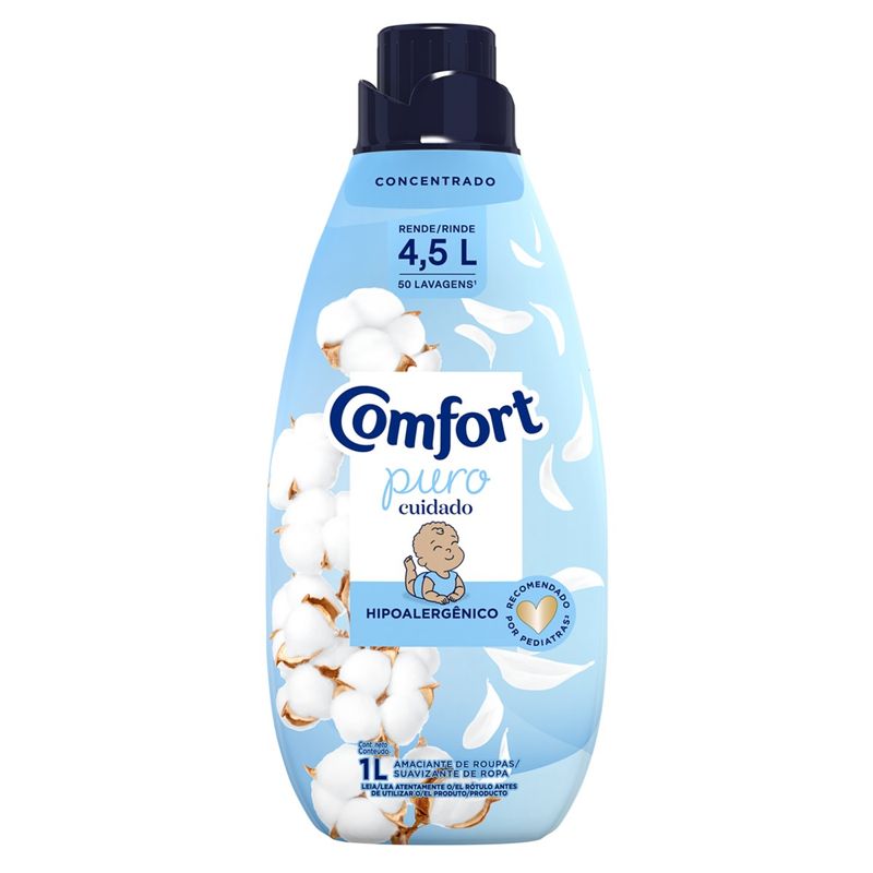 • O Amaciante Concentrado Comfort Puro Cuidado foi especialmente desenvolvido para peles sensíveis e delicadas, sendo dermatologicamente testado • A nova fórmula contém óleo de argan que previne os danos da lavagem, mantendo as cores dos tecidos vibrantes e evita a formação de bolinhas e esgarçamento**. Garante maciez e suavidade aos tecidos • Com um toque de aveia* que traz carinho e delicadeza até para as peles mais sensíveis, seguro para usar nas roupas de bebê • O Amaciante Concentrado Comfort Puro Cuidado tem um perfume suave e é hipoalergênico, recomendado para peles delicadas*** • A embalagem deste amaciante é feita com 50% de plástico reciclado, diminuindo assim o impacto ambiental • O Amaciante Concentrado Comfort possui uma embalagem econômica LEVE MAIS E PAGUE MENOS que rende mais de 4 L, o equivalente a 50 lavagens****. Menos de meia tampinha basta para lavar suas roupas! O Amaciante Concentrado Comfort Puro Cuidado tem perfume suave com extrato de aveia, recomendado para peles delicadas*** e faz as roupas durarem muito mais! Sua nova fórmula contém óleo de argan, um óleo natural com alto potencial nutritivo, que previne os danos da lavagem, mantendo as cores do tecido vibrantes por mais tempo, evitando a formação de bolinhas e esgarçamento**. Este amaciante de roupas contém extrato de aveia* que penetra profundamente nas fibras do tecido durante a lavagem, deixando-as com uma maciez irresistível, toque gentil e com todo cuidado que as peles sensíveis merecem. É livre de corantes e das microcápsulas de perfume, componentes com alto potencial de irritabilidade para as peles mais delicadas. Os ingredientes de Comfort Concentrado conseguem alinhar e proteger o tecido, reduzindo o atrito entre as fibras de suas roupas durante o processo de lavagem. Sua fórmula além de ser hipoalergênica é dermatologicamente testada por pediatras, dermatologistas e outros profissionais da saúde. Dessa forma, O Amaciante Concentrado Comfort Puro Cuidado é indicado para