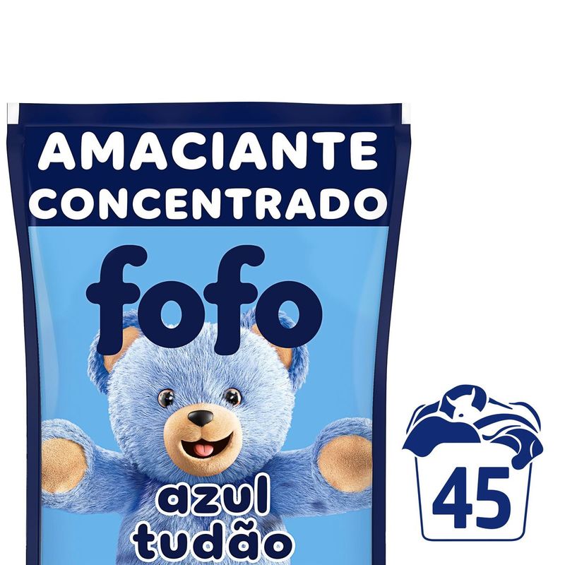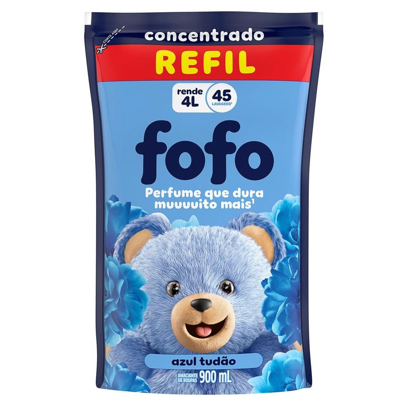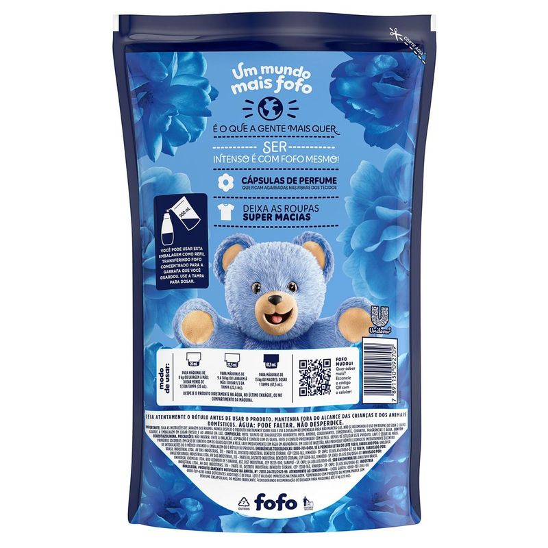 • Amaciante Fofo Azul Tudão, com perfume que dura muuuuito mais* • É muita maravilhosidade junta: suas roupas com suuuper perfume, suuuper maciez e suuuper rendimento. Ser intenso é com Fofo mesmo! • Com cápsulas de perfume que ficam agarradas nas fibras dos tecidos • Deixa suas roupas super macias • Amaciante de Roupa Fofo Azul Tudão, um mundo mais Fofo é o que a gente mais quer • Você pode usar essa embalagem como refil transferindo Fofo Concentrado para a garrafa que você guardou. Use a tampa para dosar Fofo Azul Tudão é um amaciante concentrado com perfume que dura muuuuito mais* e com 900 ml rende até 4 L e 45 lavagens**. Os amaciantes de roupas Fofo agora têm uma intensidade que anima, com perfume que dura muuuuito, deixa as roupas super macias e rende demais! Ser intenso é com FOFO mesmo! E o Fofo Azul Tudão não tá de brincadeira. É muita maravilhosidade junta: suuuper perfume, suuuper maciez e suuuper rendimento. Um mundo mais fofo é o que a gente mais quer. Fofo no jeito de agir, sabe assim? Suas roupas não querem mais outra vida! Fofo Azul Tudão é um amaciante de roupa concentrado que possui cápsulas de perfume que ficam agarradas nas fibras dos tecidos e fazem o perfume durar muuuuito mais, se tornando um produto indispensável em sua lavanderia. Explosão de perfumes que dão aquele ânimo e deixam seu dia ainda melhor. Modo de usar: para máquinas de 8 kg ou lavagem à mão: dosar menos de 1/3 da tampa. Para máquinas de 9 a 14 kg ou lavagem à mão: dosar 1/3 da tampa. Para máquinas de 15 kg ou maiores: dosar 1 tampa (67,5 ml). Você pode usar essa embalagem como refil transferindo Fofo Concentrado para a garrafa que você guardou. Use a tampa para dosar. *Comparado com produto da mesma marca sem perfume encapsulado, do mesmo fabricante. **Considerando recomendação de dosagem para máquina de até 8 kg (20 ml).