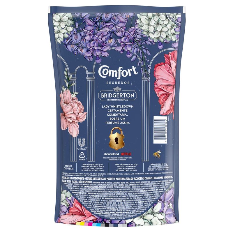 • Amaciante Concentrado Comfort Segredos Bridgerton, é uma Edição Especial e limitada, em parceria com a Netflix • Comfort Segredos Bridgerton tem um perfume misterioso que se mantêm em suas roupas por muito tempo. Descubra o segredo mais perfumado de Bridgerton • O amaciante de roupas Comfort Segredos Bridgerton possui um perfume exclusivo feito com ingredientes da perfumaria fina • Comfort Segredos Bridgerton é um amaciante de roupas concentrado que possui cápsulas de perfume de longa fixação para uma experiência olfativa sofisticada e marcante • Experimente o Amaciante Concentrado Comfort Bridgerton: o segredo mais perfumado da realeza! • Comfort segredos Bridgerton: Lady Whistledown certamente comentaria sobre um perfume assim O Amaciante Concentrado Comfort Segredos Bridgerton possui um perfume misterioso, para que descubra o segredo mais perfumado da realeza. Desenvolvido em Edição Especial em parceria com a Netflix, este amaciante de roupas concentrado possui um perfume exclusivo que reúne os ingredientes mais requintados da perfumaria fina, que garantem uma fragrância sofisticada e marcante. O amaciante de roupas Comfort Segredos Bridgerton garante longa fixação dos perfumes, para que suas roupas fiquem perfumadas por muito mais tempo. Além de cuidar e fixar o perfume em suas roupas, o amaciante Comfort Segredos garante maciez aos tecidos, para roupas sempre impecáveis. Por ser concentrado, menos de meia tampinha basta para descobrir o segredo mais perfumado da realeza: para máquinas até 8 kg ou lavagem à mão, dosar menos de 1/3 da tampa (20 ml). Rende muito mais! Comfort Segredos concentrado possui perfume encapsulado que penetra no tecido durante o processo de lavagem de roupa, deixando-a muito mais cheirosa até mesmo depois de seca! O motivo? Quando você se movimenta, essas cápsulas de perfume se rompem e liberam essa fragrância misteriosa e incrível, fazendo com que aquele cheiro de perfumaria fina dure muito mais! Experimente Comfort Bridgerton Ed