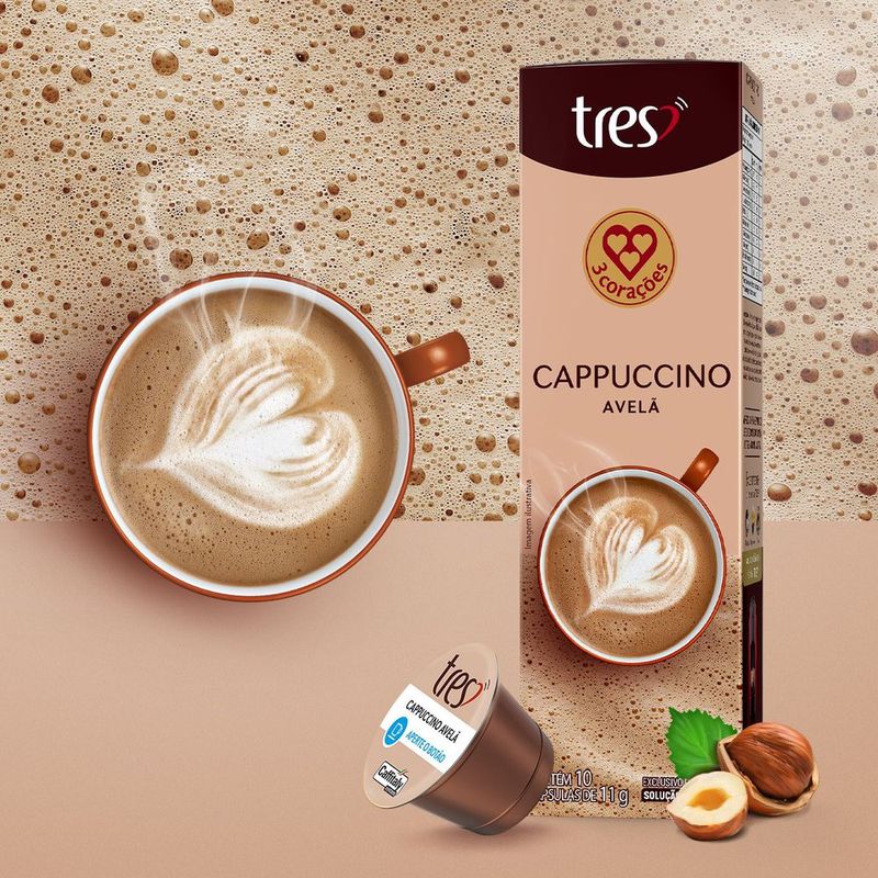 A cápsula do cappuccino Avelã da 3 Corações prepara um café cremoso, gostoso e de forma muito prática. Feito à base de café, leite, cacau e canela, o já conhecido clássico da marca inova com um delicioso toque de avelã, que vai conquistar sua família pelo sabor marcante e a textura aveludada. Ideal para vários momentos do dia, a cápsula de café cappuccino é de uso exclusivo nas máquinas Tres. O produto vem em 10 unidades de 11 gramas.
