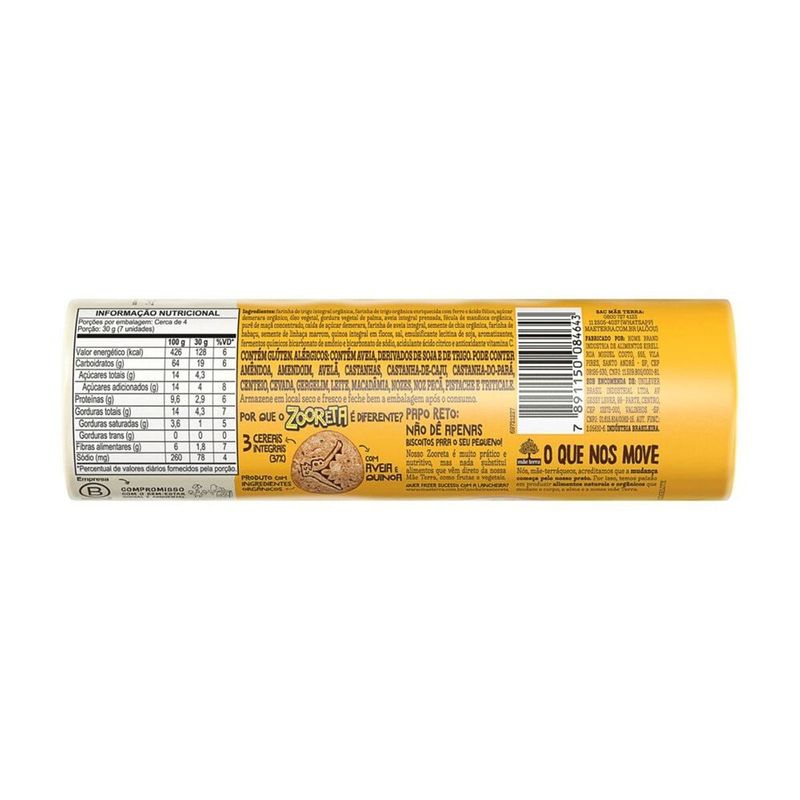 • O Biscoito Mãe Terra Zooreta Maisena com Aveia e Quinoa é um biscoito infantil orgânico, saudável e perfeito para um lanchinho saudável das crianças • O Biscoito Mãe Terra é preparado com 3 grãos integrais (37%), tais como chia, quinoa e trigo, somente com ingredientes naturais, livre de pozinhos artificiais • Biscoitos preparados com cereais integrais, que preservam todas as suas partes nutritivas (gérmen, endosperma e farelo) e sementes • É um biscoito integral, orgânico e livre de ingredientes geneticamente modificados, corantes, aromas e adoçantes artificiais • O Biscoito Mãe Terra Zooreta Maisena com Aveia e Quinoa é um snack prático e mais nutritivo, perfeito para colocar na lancheira das crianças e para ser consumido em qualquer momento do dia • Nós, mãe-terráqueos, acreditamos que a mudança começa pelo nosso prato. Por isso, temos paixão em produzir alimentos saudáveis, naturais e orgânicos que mudam o corpo, a alma e a nossa mãe Terra Nosso Biscoito Infantil Mãe Terra Zooreta Maisena com Aveia e Quinoa é uma opção prática de snack saudável e delicioso para as crianças. É um biscoito vegano, orgânico e com 3 grãos integrais, como aveia, quinoa e trigo. É livre de pozinhos e aromas artificiais e feito com farinha de trigo integral de verdade, moída em nossa fábrica a partir do grão orgânico inteirinho, preservando tudo que tem de bom ali para você consumir. Isso só mostra que é possível unir nutrição e muito sabor em uma coisa só! Deixa qualquer lanche das crianças mais nutritivo e saboroso, sem deixar a saúde de lado, e ainda dá aquela energia para o dia a dia! O Biscoito Mãe Terra Zooreta Maisena com Aveia e Quinoa é livre de ingredientes geneticamente modificados. Fundada em 1979, a Mãe Terra é líder no segmento de alimentos naturais e orgânicos no Brasil. E é com muita alegria que podemos dizer que somos uma Empresa B, comunidade global de organizações que buscam o desenvolvimento socioambiental, além de econômico. Temos o desafio de crescer, mas