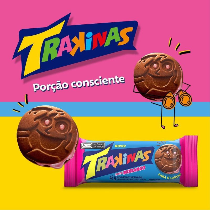 Leve para casa o Biscoito Recheado Trakinas Morango 42g. Embalagem individual com 4 unidades de biscoito.Trakinas é o biscoito que é a sua cara! Além de ser fonte de cálcio, vem uma embalagem prática de 42g, ideal para a lancheira ou um lanche no meio do dia, onde quer que você esteja. Compre agora e aproveite todo o sabor de Trakinas! Tabela nutricional e alergênicos: veja a tabela nutricional e ingredientes nas imagens. Produto com alto teor de açúcar adicionado.