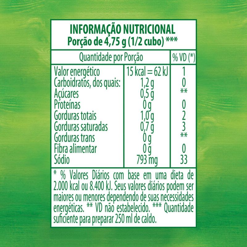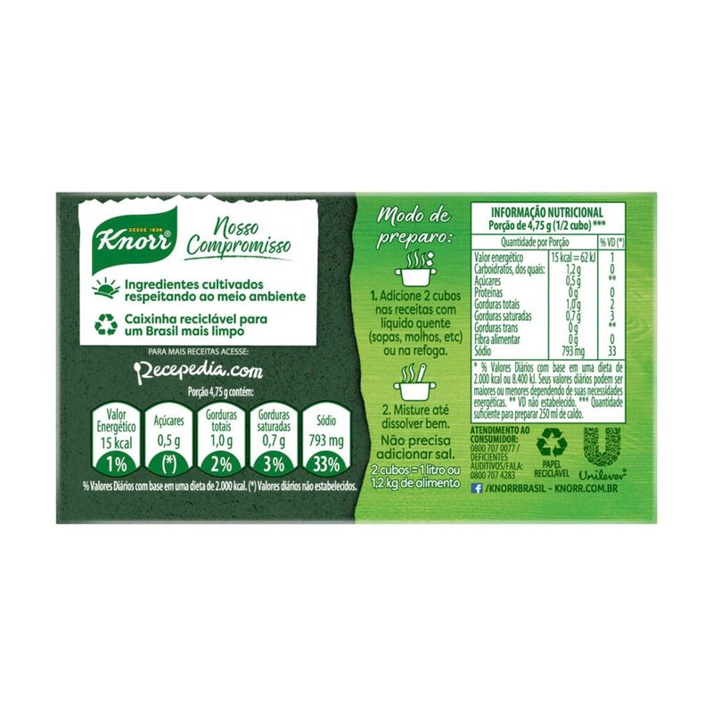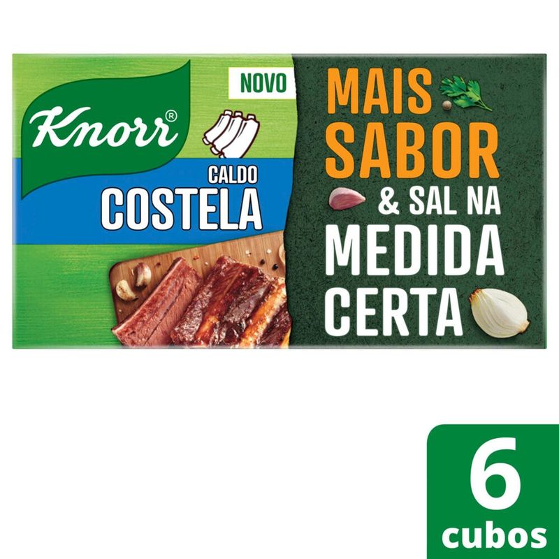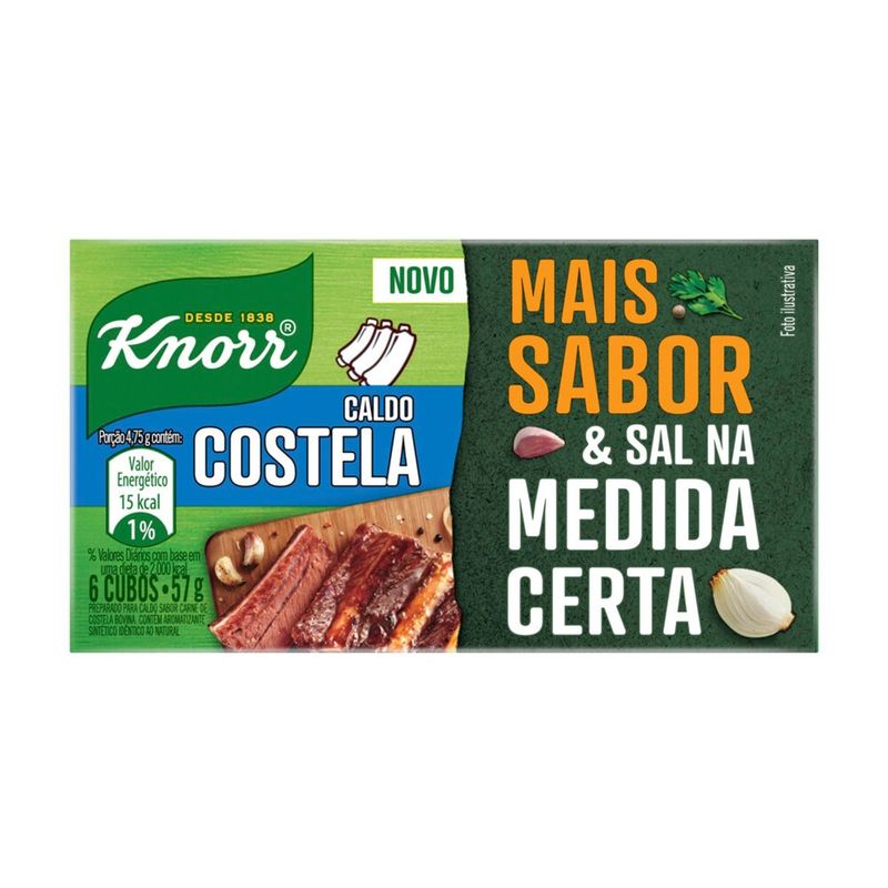 • Caldo Knorr Costela: Mais sabor e sal na medida certa. • Feito com ervas e especiarias cuidadosamente selecionadas. • Nosso Caldo contém: alho, salsa, cúrcuma, concentrado natural de cebola e pimenta-preta. • O Caldo Knorr é bom para você e para o planeta: com ingredientes cultivados respeitando ao meio ambiente, caixinha reciclável e produzido em uma fábrica com zero emissão de gás carbônico! • Garanta mais sabor ao seu prato com Caldo Knorr! • Utilize 1 cubo de caldo para 600g de alimento e não adicione mais sal.Com sal na medida certa e feito com ervas e especiarias selecionadas, como alho, salsa, cúrcuma, concentrado natural de cebola e pimenta-preta, o Caldo Knorr Costela traz mais sabor e cor às suas receitas, dando um tempero todo especial para a sua carne! A seleção minuciosa de ingredientes é o primeiro passo para a criação dos produtos Knorr e a preservação do sabor das ervas e vegetais, tratados com tanto carinho desde as fazendas até a nossa fábrica, é resultado do processo de desidratação, um sistema simples e seguro para retirada de água dos alimentos. Esta é uma metodologia bastante antiga, que serve como alternativa à aplicação de conservantes e que indica o uso de ingredientes de verdade! Além disso, o produto é extremamente versátil e muito fácil de ser usado: utilize 1 cubo de caldo Knorr para cada 600g de alimento ou 500ml de líquido quente, misture bem até dissolver e pronto! Não precisa adicionar sal: os produtos foram desenvolvidos para ajudar o seu dia a dia na cozinha e sua receita já contará com todo o sabor e aroma de Knorr, com o sal na medida certa. O Caldo Knorr Costela é uma opção deliciosa e prática para temperar carne! Que tal preparar uma deliciosa carne ensopada ou um churrasco com costela recheada com mandioca? O Caldo Knorr é bom para você e bom para o planeta, uma vez que possui ingredientes cultivados respeitando ao meio ambiente, embAlagem reciclável e é produzido em uma fábrica com zero emissão de gás carbônico! Conheça tod