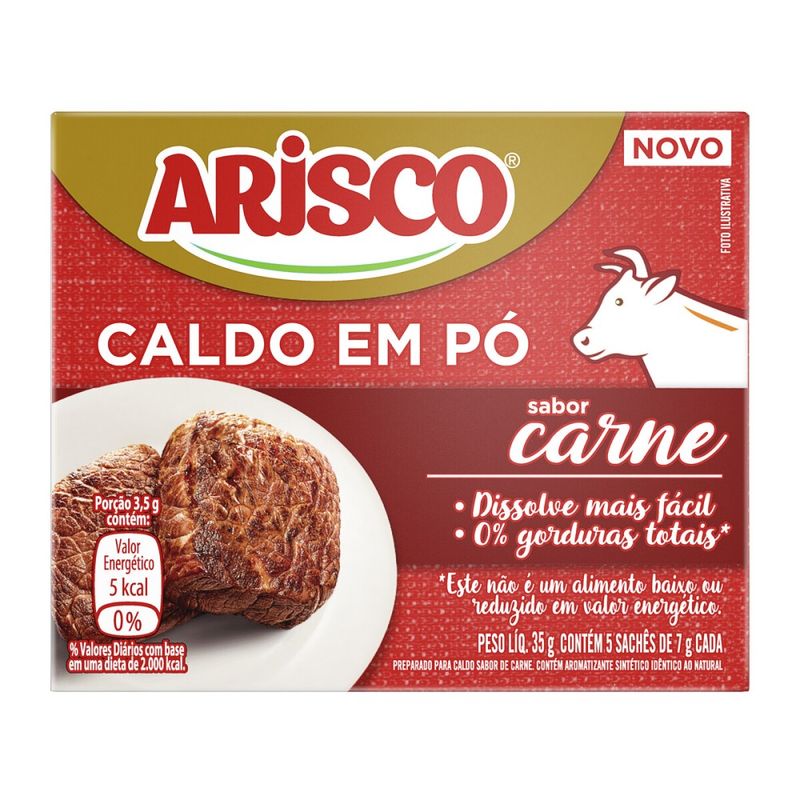 Caldo em Pó Arisco sabor Carne: tempero versátil para o preparo de receitas, dando aquele gostinho caseiro de sempre Por ser em pó, o Caldo de Carne Arisco dissolve muito mais fácil e é mais versátil no preparo de suas receitas Muito fácil de usar. Adicione 1 sachê do Caldo em Pó Arisco para cada 500 ml de água fervente ou 600 g de alimento, sem a necessidade de adicionar sal O Caldo de Carne em Pó Arisco é feito com ervas e especiarias cuidadosamente selecionadas e com 0% gorduras totais Caldo em Pó Arisco sabor Carne, dá gosto de ter em casa! A marca autêntica do Brasil! Experimente o Caldo em Pó Arisco Carne no preparo de uma saborosa carne de panela ou de uma carne desfiada com queijo coalho. A nova linha de Caldo em Pó Arisco chegou para garantir o gostinho caseiro de sempre a todas as preparações do seu dia a dia! Feito com ervas e especiarias selecionadas, o Caldo em Pó Arisco Carne garante aquele sabor especial para os seus pratos, tem 0% gorduras totais e, por ser em pó, dissolve mais fácil e é mais versátil no preparo das mais variadas receitas. Para usar é muito fácil, basta considerar que 1 sachê é igual a 1 cubo: utilize 1 sachê do caldo em pó para cada 500 ml de água fervente ou 600 g de alimento. Lembre-se de que não é necessário adicionar sal. E pronto, seus pratos já contam com todo o delicioso tempero de Arisco. Além de tudo isso, o caldo em pó Arisco torna o preparo das suas refeições muito mais prático, pois já vem na dose exata do sabor, basta abrir o sachê e aplicar nos alimentos! Experimente o Caldo em Pó Arisco Carne no preparo de uma saborosa carne de panela ou de uma carne desfiada com queijo coalho. Com certeza a família toda vai adorar! A linha completa conta com duas opções de sabores para você: Galinha e Carne. Não deixe de experimentar! *Este não é um alimento baixo ou reduzido em valor energético.