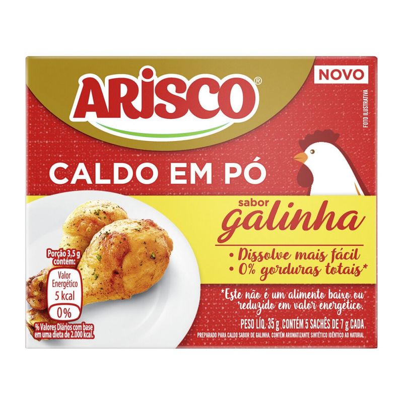 Caldo em Pó Arisco: mais versátil no preparo de receitas. Em pó! Dissolve mais fácil. 1 sachê = 1 cubo Fácil e prático: utilize 1 sachê para cada 600g de alimento e não adicione mais sal. Com 0% gorduras totais.