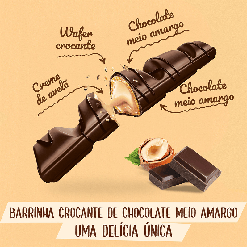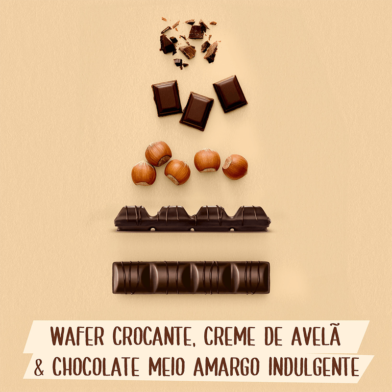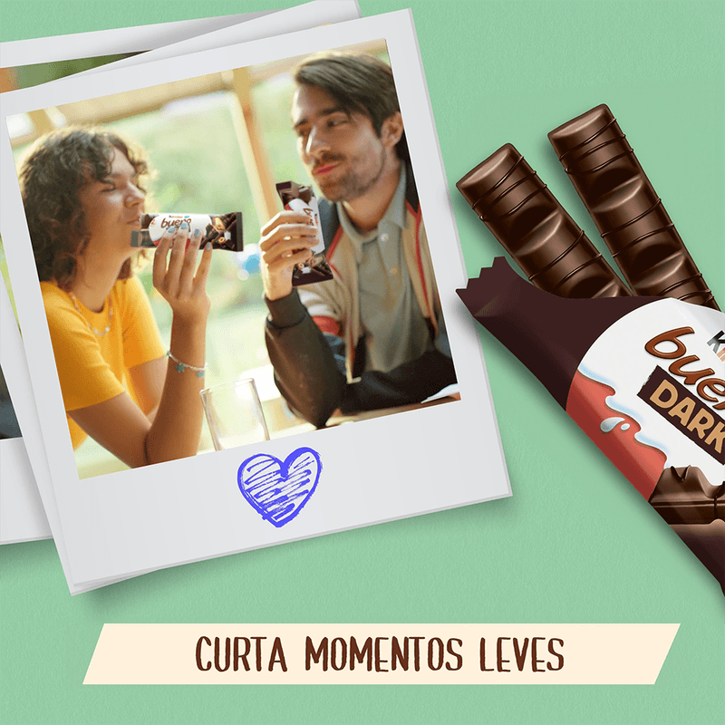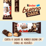 Bateu a fome no meio da tarde? Experimente Kinder Bueno Chocolate Dark são duas barrinhas crocantes de wafer, coberto com chocolate dark e com um cremoso e delicioso recheio de leite e avelãs que vai te surpreender. Alegre o seu dia com um Kinder Bueno Chocolate dark.