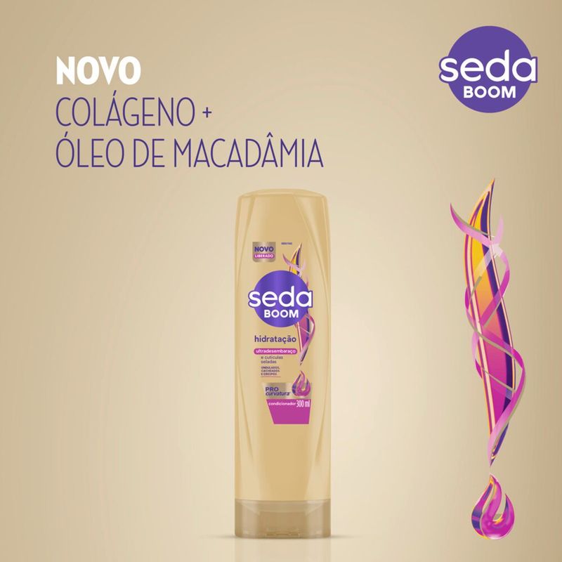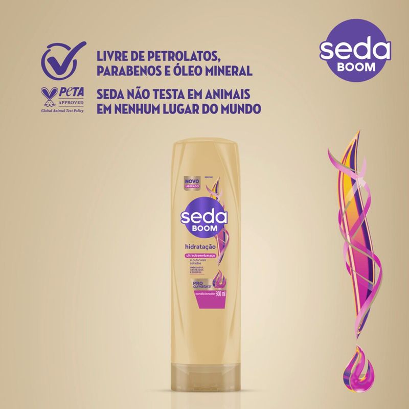 • Seda Boom Hidratação Ultradesembaraço chega com um condicionador liberado • Condicionador Seda Hidratação Ultradesembaraço hidrata profundamente seu cabelo • Esse condicionador hidrata e sela suas cutículas, para ultra desembaraçar e ativar o brilho nos cabelos crespos, cacheados e ondulados • A fórmula desse condicionador contém colágeno e óleo de macadâmia, conhecidos por estimular o crescimento, prevenir a queda dos fios e proteger naturalmente os cabelos • Condicionador hidratação com tecnologia Pro Curvatura, mantém os fios juntos e alinhados, ativando e memorizando a sua curvatura • Esse condicionador é livre de petrolatos, parabenos e óleo mineral em sua composição A vida é cheia de possibilidades - tenha um cabelo incrível para todas elas. Está pronta para conhecer a Nova Geração Seda Boom? O Condicionador Seda Boom Hidratação Ultradesembaraço possui a tecnologia Pro Curvatura que mantém os fios juntos e alinhados, ativando e memorizando a sua curvatura por até 72h. Esse Condicionador é liberado, livre de petrolatos, parabenos e óleo mineral em sua composição. Sua fórmula hidratante contém Colágeno + Óleo de Macadâmia, conhecidos por estimular o crescimento, prevenir a queda dos fios e proteger naturalmente os cabelos. Esse condicionador hidrata profundamente o seu cabelo e sela suas cutículas, para ultra desembaraçar e ativar seu brilho, como ele merece! O Condicionador Seda Boom Hidratação Ultradesembaraço é indicado para cabelos crespos, cacheados e ondulados, podendo ser usado diariamente. Pronta? Após lavar com Shampoo Seda Boom Hidratação, coloque na mão, aplique nos cabelos molhados. Espalhe por todo o cabelo, concentrando no comprimento e pontas. Deixe agir por 30 segundos e enxágue bem. Para resultados mais incríveis use toda a linha Seda Boom: Shampoo, Máscara de Tratamento, e os Cremes para Pentear. Seda possui a certificação Cruelty-Free da PETA, o que significa que não testa seus produtos em animais. #JuntasArrasamos com fios mais lind
