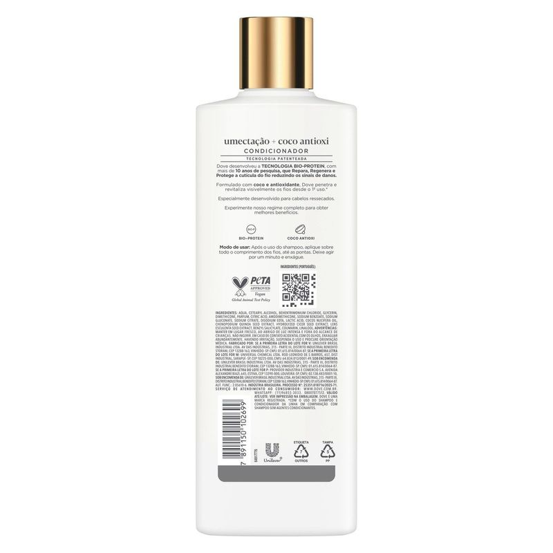 • Dove Condicionador Umectação + Coco Antioxi nutre profundamente com óleo de coco, restaurando brilho e maciez aos fios secos e opacos • Condicionador com ativo nutritivo do coco para nutrição capilar que repõe lipídios essenciais e sela as cutículas em apenas 1 minuto* • Com a tecnologia patenteada Umectação + Coco Antioxi e BIO-PROTEIN, repara, regenera e protege a cutícula contra os principais sinais de danos • Dove Condicionador Umectação + Coco Antioxi garante brilho intenso, fios leves, alinhados e até 10× mais resistentes à quebra* • Condicionador com ação antioxidante e umectante que age como creme condicionante para fios ressecados, reduz o frizz e protege contra danos futuros O Dove Condicionador Umectação + Coco Antioxi é especializado em cabelos ressecados, combinando óleo de coco e antioxidantes para nutrição profunda. Sua tecnologia patenteada BIO-PROTEIN, desenvolvida em mais de uma década de pesquisa, repara e protege a cutícula capilar, reduzindo visivelmente os sinais de danos desde a primeira aplicação*. Expert em danos, este condicionador umectante penetra nos fios com coco e agentes antioxidantes, revitalizando cabelos opacos e quebradiços. Ideal para uso regular após o shampoo da mesma linha, proporciona hidratação duradoura e brilho intenso, mesmo em fios severamente ressecados*. Indicado para todos os tipos de cabelos, principalmente os secos, opacos e danificados, o condicionador Dove pode ser usado diariamente como parte de um cronograma capilar completo. Para melhores resultados, utilize a linha completa Dove Umectação + Coco Antioxi. *Com o uso do shampoo e condicionador da linha em comparação com shampoo sem agentes condicionantes.
