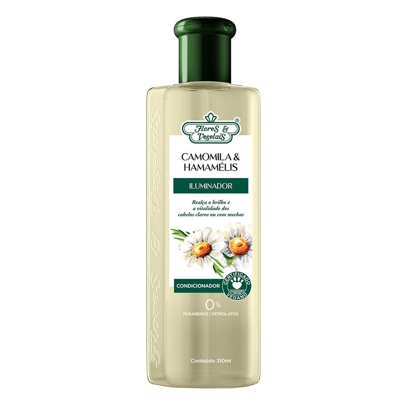 O Condicionador Camomila & Hamamélis Iluminador Flores & Vegetais, foi formulado com extratos vegetais específicos para realçar naturalmente a beleza, proporcionando brilho e maciez aos cabelos loiros naturais, castanho claro e com mechas, aumentando também a vitalidade, leveza e proteção dos fios.