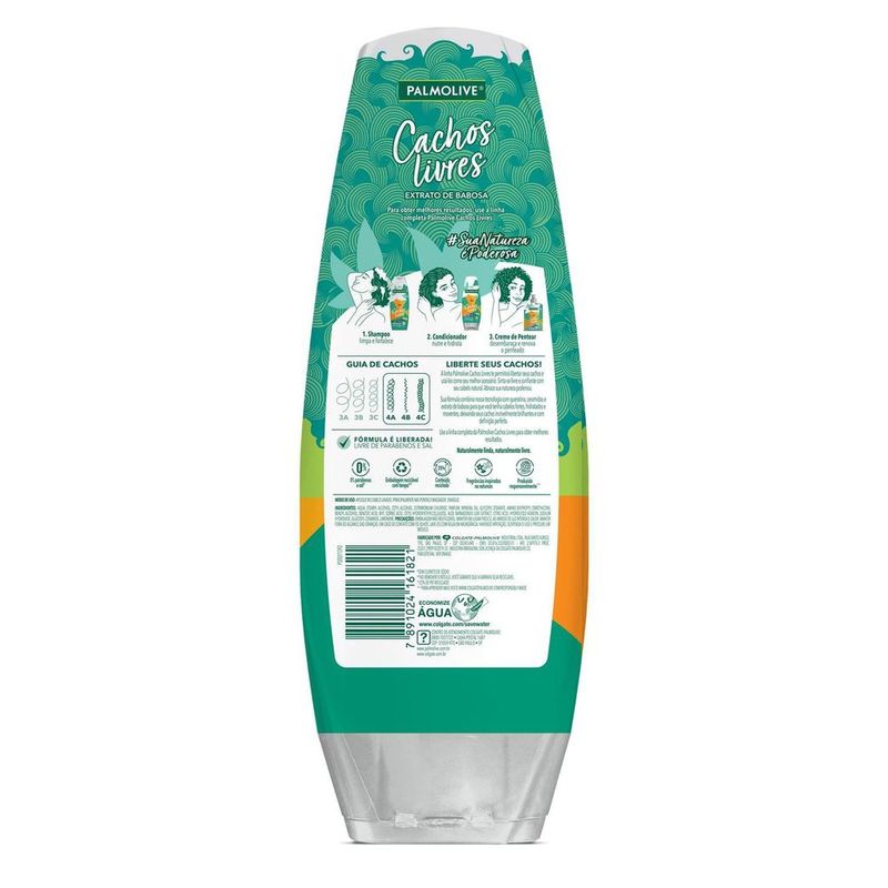 O Condicionador Palmolive Cachos Livres Extrato de Babosa foi desenvolvido especialmente para a nutrição e hidratação de cabelos cacheados, facilitando o penteado e para manter um brilho incrível e perfeita definição. Fórmula enriquecida com extrato de babosa, ingrediente natural que permite libertar seus cachos e usá-los como seu melhor acessório!
