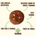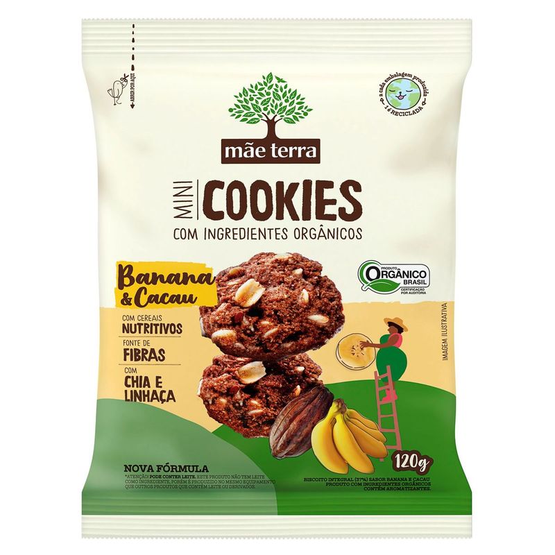 • Os Mini Cookies Mãe Terra são integrais e orgânicos, com mix de grãos nutritivos, chia, linhaça e o delicioso sabor de banana e cacau • Os Mini Cookies Mãe Terra são elaborados com farinha de trigo integral de verdade, moída dentro de casa a partir do grão orgânico inteirinho, preservando tudo de bom que tem ali • Cookies integrais preparados com ingredientes pouco processados, mas muito nutritivos, rico em fibras, vitaminas e minerais muito importantes para o funcionamento do nosso organismo • Livres de ingredientes geneticamente modificados, corantes, açúcar branco e adoçantes artificiais. É um biscoito integral e orgânico, privilegiando os pequenos agricultores brasileiros • Os Mini Cookies Integrais Mãe Terra Banana & Cacau podem ser consumidos a qualquer momento do dia, como uma boa opção de snack saudável, mais leve e prático para levar para onde quiser • Nós, mãe-terráqueos, acreditamos que a mudança começa pelo nosso prato. Por isso, temos paixão em produzir alimentos naturais, saudáveis e orgânicos que mudam o corpo, a alma e a nossa mãe Terra. Nossos Mini Cookies Integrais Mãe Terra Banana & Cacau são um delicioso snack saudável, vegano e orgânico feito com cereais nutritivos, além de sementes como chia e linhaça. É livre de pozinhos artificiais e feito com farinha de trigo integral de verdade, moída na nossa fábrica a partir do grão orgânico inteirinho, preservando tudo que tem de bom ali para você consumir! Com pedaços de banana e cacau de verdade, esse biscoito é fonte de fibras, suprindo 10% das necessidades diárias. Isso só mostra que é possível unir nutrição e muito sabor em uma coisa só! Deixa qualquer lanche mais saboroso sem deixar a saúde de lado e ainda dá aquela energia para o dia a dia corrido! Os Mini Cookies Integrais Mãe Terra Banana & Cacau são saudáveis, livres de ingredientes geneticamente modificados, corantes e adoçantes artificiais. É um produto orgânico, privilegiando os pequenos agricultores brasileiros, desenvolvendo a agri