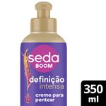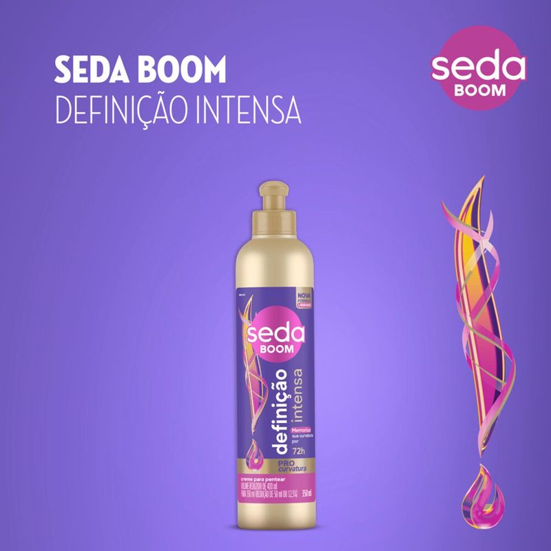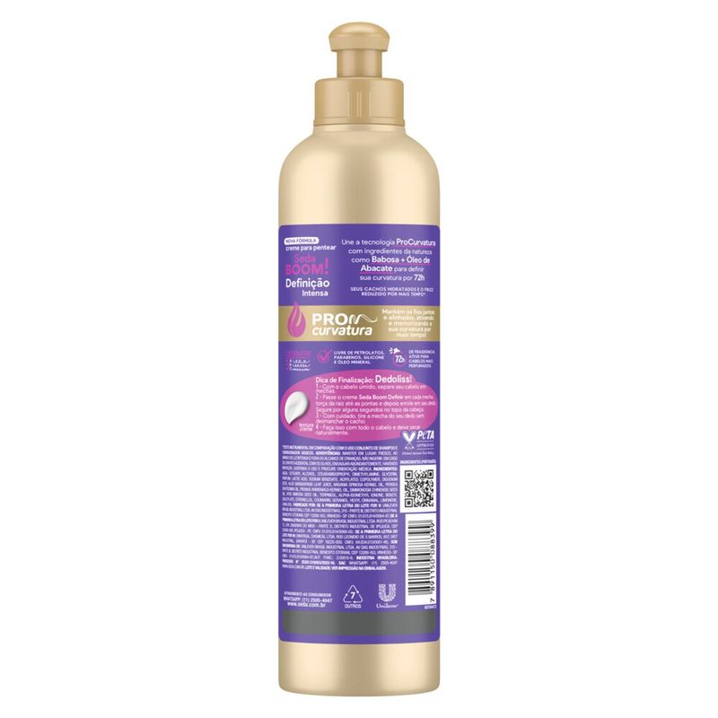 • O Creme para Pentear Seda Boom Definição Intensa possui exclusiva tecnologia ProCurvatura, que mantém os fios juntos e alinhados, ativando e memorizando a curvatura do cabelo por 72 horas • A fórmula desse creme para pentear é enriquecida com babosa, que promove maciez e brilho aos fios, e óleo de abacate, que nutre e dá resistência aos fios contra quebra • Creme para definição que ativa a curvatura dos seus cachos por 72h*, reduzindo seu volume e frizz, sem pesar • Este creme para pentear Seda Boom possui uma fragrância que garante 72h de cabelos perfumados por mais tempo • Esse creme para pentear é ideal para cabelos cacheados ou ondulados e é liberado, livre de petrolatos, parabenos, silicone e óleo mineral • O Creme para Pentear Seda Boom Definição Intensa deixa seu cabelo cacheado profundamente nutrido e com volume reduzido Seda Boom agora em nova embalagem, mas com a fórmula que você já conhece para eternizar seus cachos! O Creme para Pentear Seda Boom Definição Intensa possui tecnologia ProCurvatura, que mantém os fios juntos e alinhados, ativando e memorizando a sua definição por 72h*. Este creme é enriquecido com babosa, que promove maciez e brilho aos fios, e óleo de abacate, que nutre e dá resistência aos fios contra quebra. Esta fórmula vai deixar seus fios nutridos profundamente e com volume reduzido como eles merecem! Esse creme de cabelo é liberado, livre de petrolatos, parabenos, silicone e óleo mineral em sua composição. Com a Linha Seda Boom você escolhe seu creme para pentear de acordo com a finalização que deseja, afinal, sejam os seus cabelos cacheados, crespos ou ondulados, você é livre para se expressar como quiser. Dicas de finalização: 1. Com o cabelo úmido, divida-o em 4 partes e aplique o Creme para Pentear Seda Boom Definição Intensa. 2. Usando os dedos, separe o cabelo em pequenas fitas como se estivesse penteando. Amasse as fitas com as mãos em direção à raiz – cada fita formará um cacho! 3. Se na sua finalização você prefere
