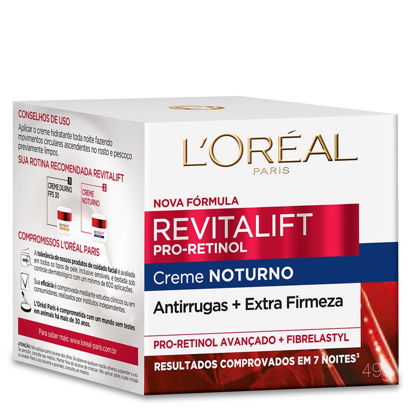 O Creme Hidratante Revitalift Pro-Retinol Noturno de L¿Oréal Paris é um creme de tratamento facial anti idade para uso noturno e intenso desenvolvido para todos os tipos de pele. O Revitalift Noturno age no momento em que a pele se recupera de todos os danos sofridos durante o dia, combatendo os sinais da idade para uma aparência saudável e jovem. Revitalift Noturno creme possui uma fórmula criada especialmente para agir durante a noite, momento em que a renovação celular é mais intensa. Tecnologia Revitalift PRO RETINOL Pro Retinol: um poderoso ativo antirrugas, que estimula a renovação celular. Rugas ainda mais profundas são visivelmente suavizadas e a pele tem sua aparência uniformizada, revelando uma superfície mais lisa, macia e radiante. Elasti Flex: ingrediente ativo inovador, resultado de 5 anos de pesquisa e patenteado por L¿Oréal, protege as fibras de elastina, fazendo com que elas fiquem mais numerosas e fortalecidasBenefícios: Combate a flacidez da pele. Define o contorno do rosto. Deixa pele com aspecto mais alisado. Deixa a pele mais macia, radiante e jovem. Atua na renovação celular noturna, recuperando a pele dos danos diários. Possui textura leve, de alta absorção e fácil de espalhar.