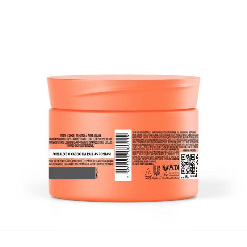 • Regeneração intensa de danos • Reverte os danos e reconstrói as fibras capilares* • Fortalece o cabelo da raiz às pontas • Indicado para cabelos danificados e sem brilho • Cabelos visivelmente saudáveis. A Máscara de Tratamento Seda Colágeno + Vitamina C reverte os danos e reconstrói as fibras capilares. Sua fórmula é enriquecida com 5% COLÁGENO-VITAMINA C COMPLEX, um poderoso mix com Colágeno e Vitamina C, que penetra profundamente reparando as fibras capilares, fortalecendo o cabelo da raiz às pontas, tornando o cabelo visivelmente saudável*. Indicado para cabelos danificados e sem brilho. MODO DE USO: Com os cabelos úmidos, aplique em toda a extensão dos cabelos até as pontas (evitando a raiz!), trabalhando de cima para baixo, mecha por mecha. Deixe agir por 3 minutos e depois enxágue. *Repara danos interno e externo, com uso do shampoo e condicionador da linha vs shampoo sem agentes condicionantes.