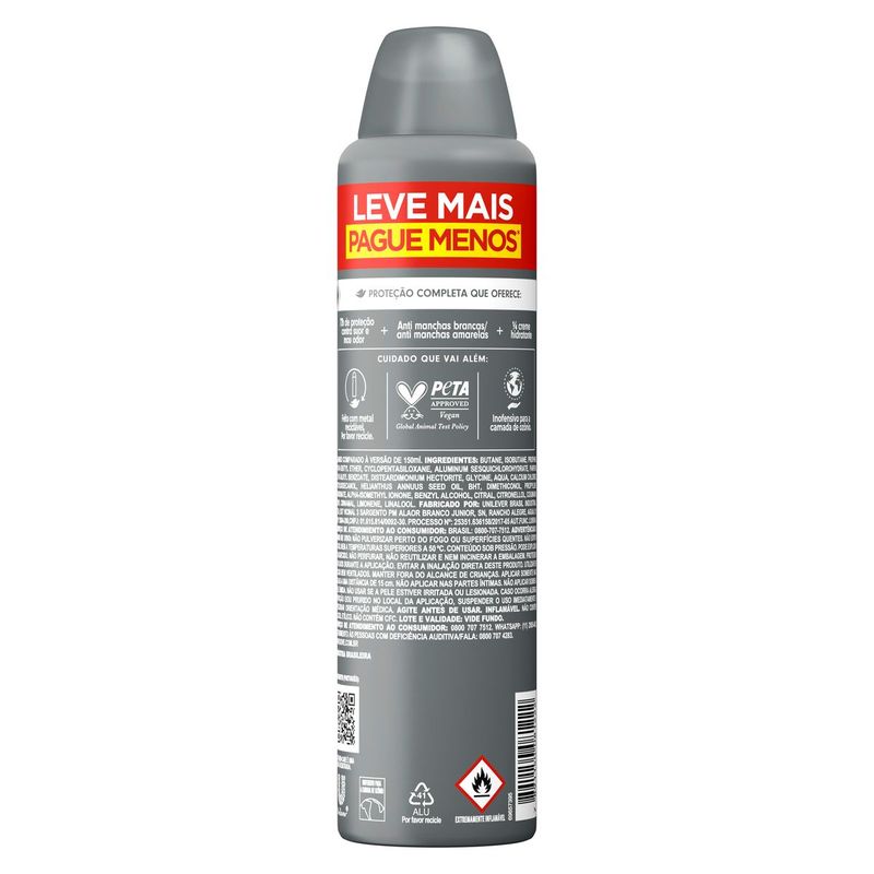 • O Desodorante Aerosol Dove Men+Care Invisible Dry 250 ml é um antitranspirante que protege suas roupas contra machas brancas, testado em 100 cores • Antitranspirante masculino com 1/4 de creme hidratante. Proteção contra o suor, o mau odor e contra manchas nas roupas • Antitranspirante aerosol com 72h de proteção contra o suor e mau odor e fragrância que dura o dia todo • Antitranspirante masculino, 72h de proteção e um toque a mais de cuidado com 1/4 de creme hidratante • Antitranspirante aerosol sem álcool e com tecnologia Tripla Ação que ajuda a proteger a pele, reduzindo o risco de irritações • Este antitranspirante é o formato mais sustentável de Dove aerosol. Leve mais, pague menos* O antitranspirante Aerosol Dove Men+Care Invisible Dry foi testado em 100 cores para garantir proteção contra manchas brancas, além de uma proteção de 72 horas que te mantém seco e protegido contra o suor e mau odor o dia todo. Além de garantir a proteção que você espera de Dove Men+Care, o Desodorante Invisible Dry 250 ml é mais econômico, onde você leva mais produto e paga menos*. O que faz de um antitranspirante o aliado perfeito para o dia a dia? Para nós, é a união entre proteção e cuidado. É por isso que a linha de antitranspirantes Dove Men+Care combina uma avançada fórmula, que contém ¼ de creme hidratante, com a tecnologia Tripla Ação que protege a sua pele contra irritação. Dove Men+Care tem o que você precisa para se sentir sempre seguro e com uma agradável sensação de frescor que dura o dia inteiro. Para obter o máximo do seu Desodorante Aerosol Dove Men+Care Invisible Dry, agite a embalagem para ativar os ingredientes. Segure-a voltada para cima a 15 cm das suas axilas e aplique um jato de dois segundos em cada uma. Experimente os desodorantes, sabonetes e shampoos Dove Men+Care e conheça um novo jeito de se cuidar. Dove Men+Care celebra uma nova definição de força masculina, em que o cuidado com o bem-estar do seu corpo é o centro de tudo. Dove Men é cer