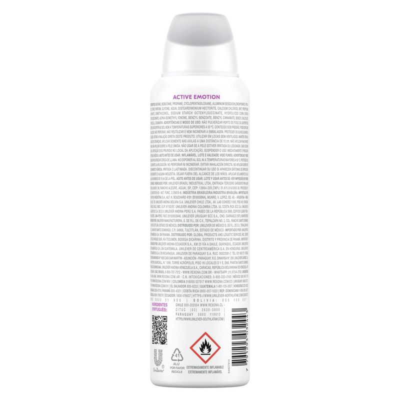 • A exclusiva fórmula do Desodorante Aerosol Feminino Rexona Active Emotion garante 72 horas de proteção contra o suor e o mau odor ativado pelo movimento • O desodorante antitranspirante aerosol Active Emotion a mantém seca, refrescada, protegida e confiante para encarar qualquer situação • Desodorante feminino fácil de usar: agite e aplique nas axilas a não menos de 15 cm da pele • A fragrância desse antitranspirante contém uma combinação única de notas florais e frutadas, garantindo a sensação de frescor durante o dia inteiro • Esse desodorante antitranspirante não contém álcool* e não afeta a camada de ozônio, sua lata é de alumínio 100% reciclável, feito com energia elétrica 100% renovável • O Desodorante Aerosol Feminino Rexona Active Emotion permite que você fique sempre protegida, não importa o que aconteça. Rexona não te abandona Mais uma vez Rexona se supera e relança sua linha de desodorantes com uma fórmula inovadora, o Desodorante Aerosol Feminino Rexona Active Emotion combina um novo e exclusivo ativo antitranspirante com a tecnologia de fragrâncias encapsuladas. Esse desodorante antitranspirante aerosol a mantém protegida por até 72 horas, ativado pelo seu movimento e a deixa muito mais confiante para você encarar qualquer desafio. Com o registro de 16 patentes e mais de 300 testes técnicos, está comprovado que essa nova tecnologia antitranspirante entrega um nível de proteção contra o suor como nenhuma outra proposta regular já entregou antes. A nova e exclusiva fórmula de Rexona Active Emotion trabalha com um sistema de partículas menores e mais estáveis que formam uma barreira protetora mais resistente e duradoura contra a transpiração e o mau odor, mantendo você seca, refrescada e protegida a cada novo movimento e por muito mais tempo. Sua fragrância contém uma combinação única de notas florais e frutadas, garantindo a sensação de frescor durante o dia inteiro. A lata usada no desodorante é feita de alumínio 100% reciclável, e o produto é