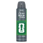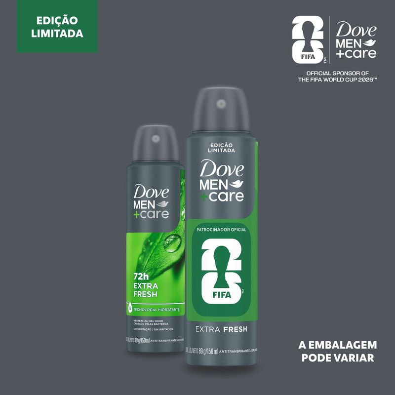 • Dove Men+Care Extra Fresh oferece 72 horas de proteção contra o suor, contém ¼ de tecnologia hidratante e neutraliza o mau odor causado pelas bactérias, sem causar irritação • A fórmula hidratante desse desodorante aerosol proporciona um cuidado único para que você tenha axilas confortáveis o dia inteiro • Desenvolvido para ser um desodorante de uso diário para homens, ajudando você a se sentir revigorado, confortável e seguro • Nossos produtos são dermatologicamente testados, para garantir proteção sem irritação à sua pele • O antitranspirante Dove Men+Care Extra Fresh possui uma fragrância refrescante e revigorante de longa duração • Dove Men+Care oferece um cuidado que vai além: desodorante com lata reciclável e fabricada com energia 100% renovável, sem danificar a camada de ozônio. Este produto é vegano, certificado pela PETA O Desodorante Aerosol Dove Men+Care Extra Fresh oferece uma proteção de 72 horas contra o suor e neutraliza o mau odor causado pelas bactérias, sem causar irritação. Com ¼ de tecnologia hidratante, este desodorante foi desenvolvido para ser usado diariamente, ajudando a se sentir revigorado, confiante e confortável o dia inteiro. Este antitranspirante combina máxima proteção com um cuidado único, para que você tenha axilas hidratadas e confortáveis. Nossos produtos são dermatologicamente testados, para garantir proteção, sem irritação à sua pele. Possui uma fragrância com perfil verde-cítrico, com notas de hortelã e fundo amadeirado que proporciona um frescor prolongado. Dove Men+Care tem o que você precisa para se sentir sempre seguro e com uma agradável sensação de frescor que dura o dia inteiro. Para obter o máximo do seu Desodorante Aerosol Dove Men+Care Extra Fresh, agite a embalagem para ativar os ingredientes. Segure-a voltada para cima a 15 cm das suas axilas e aplique um jato de dois segundos em cada uma. Dove Men+Care celebra uma nova definição de força masculina, em que o cuidado com o bem-estar do seu corpo é o centro de
