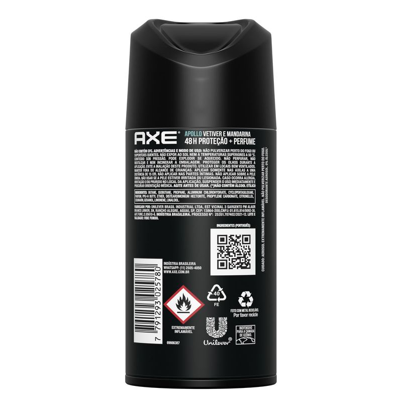 • A nova fórmula do Antitranspirante Aerosol Axe Apollo te mantém protegido e fresco o dia inteiro • Antitranspirante Aerosol que te protege contra o suor e o mau odor por 48h, além de possuir um perfume irresistível • A fragrância deste antitranspirante reúne a excelente combinação de vetiver e mandarina para uma sensação de frescor e proteção de longa duração contra o mau odor. É também formulado com 0% álcool* • Agite bem o antitranspirante Axe Apollo antes de cada uso, aplique somente nas axilas a uma distância de 15 cm e sinta a diferença! • Este antitranspirante aerosol Axe vem com um novo design numa embalagem feita com me al reciclável, por favor recicle ela também • Antitranspirante Axe Apollo, te mantém com um perfume tão irresistível quanto um deus grego, todos os dias Com a nova fórmula do Antitranspirante Aerosol Axe Apollo, com uma mistura perfeita de vetiver e mandarina, você se sentirá mais incrível, fresco e protegido todo o dia. Sua fórmula com 0% álcool* garante proteção contra o mau odor por até 48h e possui um perfume irresistível com notas cítricas para uma sensação de frescor que dura o dia inteiro. Para aplicar, agite bem o antitranspirante Axe Apollo antes de cada uso, aplique somente nas axilas a uma distância de 15 cm e sinta a diferença! A fragrância vetiver e mandarina te deixa totalmente fresco e 100% pronto para o que quer que você faça. A lata do antitranspirante Aerosol Axe Apollo vem com um novo design numa embalagem com metal infinitamente reciclável, e para manter este ciclo, por favor recicle também ela! Não contém CFC, sendo inofensivo para a camada de Ozônio. Não importa o que aconteça, você está pronto, mais fresco e o planeta mais limpo. Axe foi criada para ajudar você a ser o seu melhor, tanto no trabalho como na sua vida pessoal. É um antitranspirante de longa duração, o que significa que você ficará perfumado ao longo do dia, mantendo o seu estilo e a sua confiança. Experimente também outras fragrâncias dos antitra