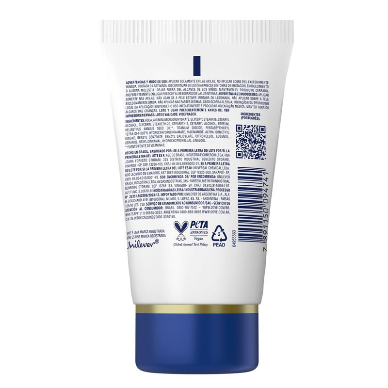 • O Desodorante Antitranspirante Dove Creme Sérum Reparação Diária possui fórmula suave e hipoalergênica, a escolha ideal para peles sensíveis • Desodorante Antitranspirante com proteção de 48h contra o suor e mau odor e sem álcool • Com ¼ de creme hidratante e vitamina E, a fórmula exclusiva desse desodorante antitranspirante combina os benefícios do sérum concentrado com a textura leve do creme • O Desodorante Creme Sérum Reparação Diária é ainda mais prático de aplicar graças ao seu aplicador de contato, direto nas axilas • Este desodorante traz toque seco às axilas com uma fragrância confortável • Só Dove desodorante cuida, protege e repara a pele das axilas desde o primeiro uso O Novo Desodorante Antitranspirante Dove Creme Sérum Reparação Diária repara o que a depilação remove em cada uso com ¼ de creme hidratante e vitamina E. Sua fórmula exclusiva combina a potência do sérum com a textura leve do creme para as suas axilas. Este desodorante antitranspirante em creme conta com um aplicador de contato, o tornando fácil de usar e eficaz em sua proteção contra o suor e mau odor por 48 horas. Absorve rapidamente, deixando um toque suave e seco o dia todo. Nossa missão é elevar a autoestima das mulheres para alcançarem o seu máximo potencial. O Desodorante Antitranspirante Dove Creme Sérum Reparação Diária oferece proteção eficaz e cuidado para a pele, respeitando a pluralidade de axilas, para você se libertar de qualquer inibição e se sentir confiante o dia todo. Advertências e modo de uso: Posicione o tubo com a tampa para cima e remova a tampa. Pressione suavemente o tubo até obter uma pequena gotinha de creme. Aplicar nas axilas secas utilizando a parte arredondada do tubo para espalhar uniformemente. Não usar se a pele estiver irritada ou lesionada. Não aplicar sobre a pele excessivamente úmida. Não aplicar nas partes intimas. Caso ocorra alergia, irritação e/ou prurido no local da aplicação, suspender o uso imediatamente e procurar orientação médica.