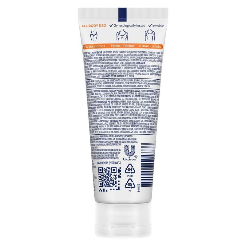 • Com o Desodorante Corporal Rexona All Body Deo Fresh Citrus você fica cheirosa no corpo todo • Desodorante feminino com tecnologia de bloqueio de odor que se adapta ao seu corpo • Desodorante indicado para outras partes do corpo, como costas, pés, virilha, bumbum, parte íntimas e mais. Consulte o modo de uso do produto • Desodorante corporal feminino com fórmula dermatologicamente e ginecologicamente testada • Uma nova etapa do cuidado com o corpo, desodorante 0% Alumínio e 0% Álcool etílico • Desodorante corporal em creme Rexona All Body Deo Fresh Citrus possui fragrância vibrante e refrescante. Chegou o novo desodorante corporal Rexona All Body Deo, com tecnologia patenteada que se adapta ao seu corpo, eliminando bactérias causadoras de mau odor de cada região do corpo e bloqueando o odor antes mesmo que ele comece, garantindo que você se sinta fresco, cheiroso e confiante no corpo todo! O novo All Body Deo está disponível em dois formatos: o creme, especialmente desenvolvido para as partes íntimas e testado ginecologicamente; e aerosol para todas as demais partes do corpo, como costas, peito, coxas e até os pés! Uma nova etapa do cuidado com o corpo, com produtos dermatologicamente testados, sem alumínio e sem álcool etílico. O desodorante corporal Rexona All Body Deo Fresh Citrus em creme possui fragrância alegre e revigorante com notas cítricas, proporcionando sensação de frescor e energia. Para usar, basta aplicar uma pequena quantidade onde desejar combater o odor, exceto nos órgãos genitais internos, aplique apenas nos órgãos genitais externos. Deixe secar antes de se vestir. Ele é leve e refrescante na pele, com aplicação invisível. O desodorante corporal de Rexona se adapta a você — onde quer que você precise — para que você possa superar seus limites. Com Rexona, queremos inspirar confiança em todos para se movimentarem mais e irem mais longe. Rexona não te abandona.