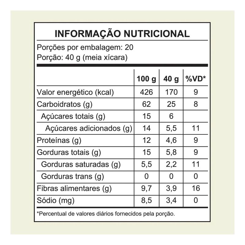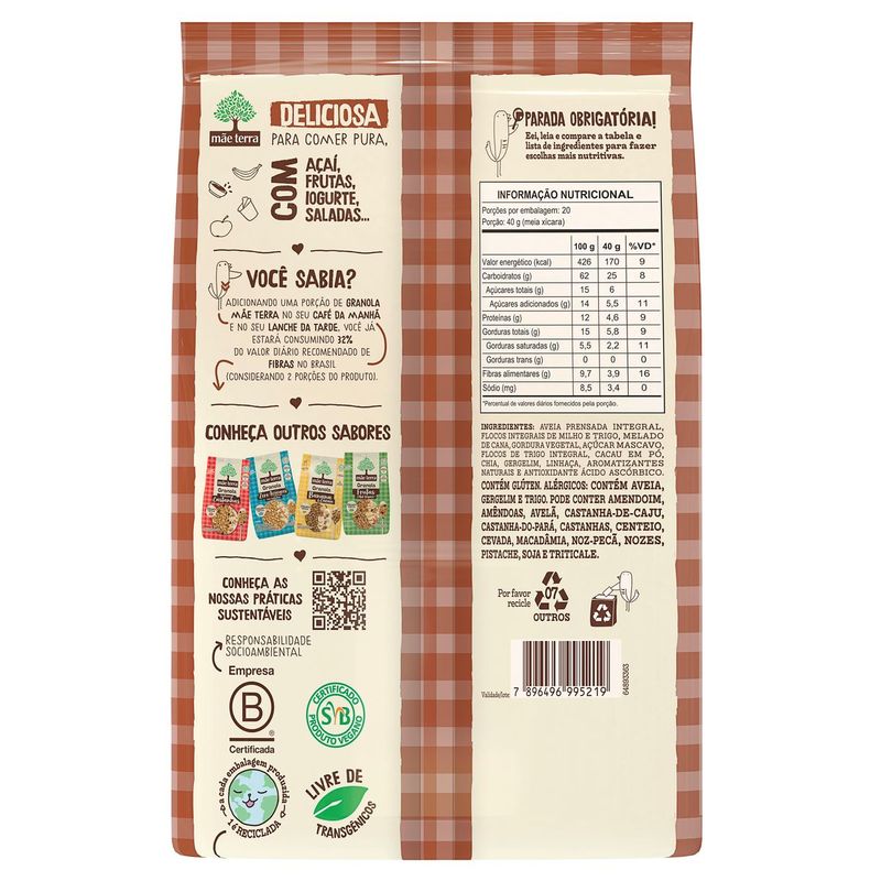 • A Granola Mãe Terra Cacau é crocante, vegana e cheia do intenso e delicioso cacau brasileiro • Comece seu dia com um café da manhã saudável e gostoso. A Granola Mãe Terra Cacau é fonte de fibras e pode ser adicionada em iogurtes, leites ou bebidas vegetais • Apaixonados por granola de verdade desde 1979. Produzimos com afeto alimentos saudáveis, privilegiando os pequenos produtores e valorizando os ingredientes nativos do Brasil • Feita com grãos integrais, com aveia, linhaça, gergelim e chia. Com ingredientes nativos do Brasil, livre de transgênicos e pozinhos artificiais • A Granola Mãe Terra Cacau é 100% vegana, fonte de fibras, perfeita para um café da manhã mais nutritivo • Nós, mãe-terráqueos, acreditamos que a mudança começa pelo nosso prato. Por isso, temos paixão em produzir alimentos saudáveis, naturais e orgânicos que mudam o corpo, a alma e a nossa mãe Terra Crocante, deliciosa e sem ingredientes com nomes esquisitos. Nossa Granola Mãe Terra Cacau é feita com cereais e sementes integrais, muuuito cacau e o nosso jeitinho mãe terráqueo de preparar uma granola gostosa, saudável e nutritiva! Além de ser crocante, deliciosa e vegana, esta granola é fonte de fibras e muito gostosa. Ela é feita com grãos integrais, com aveia, linhaça, gergelim e chia e com ingredientes nativos do Brasil. Opção perfeita para um café da manhã saudável e crocante ou para o lanchinho, como preferir! Consuma com frutas, açaí, bebidas vegetais ou coma até mesmo pura. A Granola Mãe Terra Cacau combina com tudo! Fundada em 1979, a Mãe Terra é líder no segmento de alimentos naturais e orgânicos no Brasil. E é com muita alegria que podemos dizer que somos uma Empresa B, comunidade global de organizações que buscam o desenvolvimento socioambiental, além de econômico. Temos o desafio de crescer, mas sempre respeitando os limites da natureza, valorizando a preservação ambiental e com cuidado social. Ser parte desse movimento nos mostra que estamos no caminho certo. Afinal, tem qu