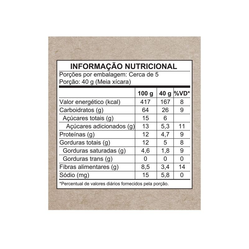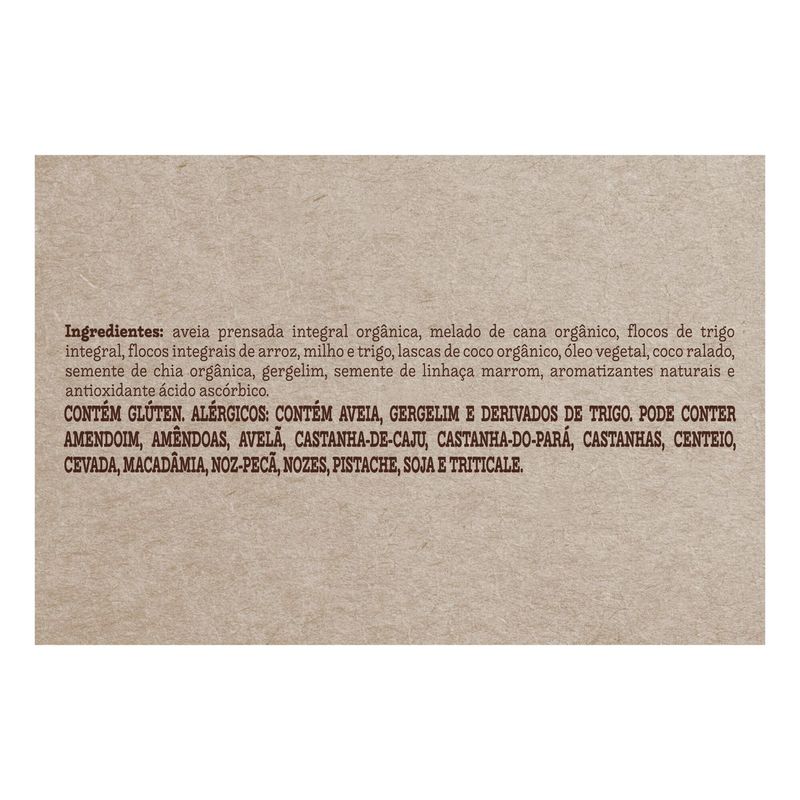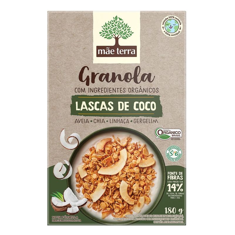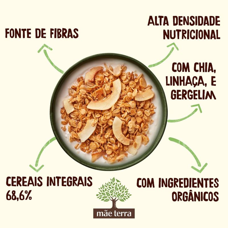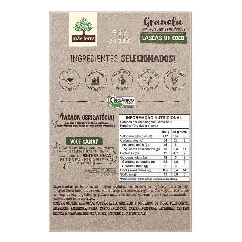 • A Granola Lascas de Coco é 100% vegana, nutritiva, feita com ingredientes orgânicos e com muito afeto • Nossa granola é perfeita para um café da manhã saudável ou para a hora do lanche, podendo ser adicionada em frutas, iogurte, açaí ou como preferir • Confiança desde 1979 produzindo alimentos saudáveis com afeto, privilegiando os pequenos produtores e valorizando os ingredientes nativos do Brasil • Feita com cereais 100% integrais, como aveia, chia, linhaça e gergelim, é muita nutrição • Granola Lascas de Coco é fonte de fibras e contém uma alta densidade nutricional • Nós, mãe-terráqueos, acreditamos que a mudança começa pelo nosso prato. Por isso, temos paixão em produzir produtos naturais que mudam o corpo, a alma e a nossa mãe Terra A Granola Lascas de Coco é feita com ingredientes selecionados e é fonte de fibras. Com lascas de coco que dão todo o toque especial! Todo esse sabor vem com muita nutrição e nossos cereais são 100% integrais. Além de ser VEGANA com tudinho de sabor e nadinha de origem animal! Nossa granola é livre de transgênicos e pozinhos artificiais. Opção perfeita para um café da manhã saudável ou para o lanchinho, como preferir! Consuma com frutas, açaí, bebidas vegetais ou coma até mesmo pura; a Granola Lascas de Coco combina com tudo! Fundada em 1979, a Mãe Terra é líder no segmento de alimentos naturais e orgânicos no Brasil. E é com muita alegria que podemos dizer que somos uma Empresa B, comunidade global de organizações que buscam o desenvolvimento socioambiental, além de econômico. Temos o desafio de crescer, mas sempre respeitando os limites da natureza, valorizando a preservação ambiental e com cuidado social. Ser parte desse movimento nos mostra que estamos no caminho certo. Afinal, tem que valer a pena levantar cedo. Nós, mãe-terráqueos, acreditamos que a mudança começa pelo nosso prato. Por isso, temos paixão em produzir alimentos naturais e orgânicos que mudam o corpo, a alma e a nossa mãe Terra. Os 7 princípios da Mãe T