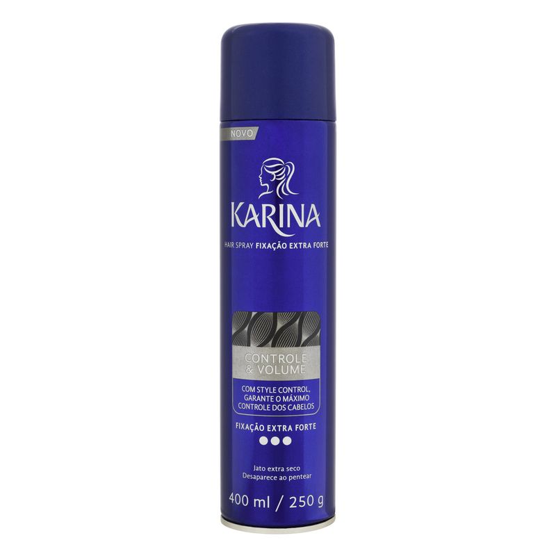 Os Hair Sprays Karina são os fixadores queridinhos das consumidoras. Eles ajudam a modelar os cabelos, mantendo os penteados firmes por mais tempo mesmo em ambientes de alta umidade, sem ressecar ou danificar o cabelo. Disponíveis em dois níveis de fixação, Normal e Extra Forte, os Srays Karina são de fácil aplicação, não deixam resíduos, nem agridem os fios e sendo ideais para todos os tipos de finalizações e penteados