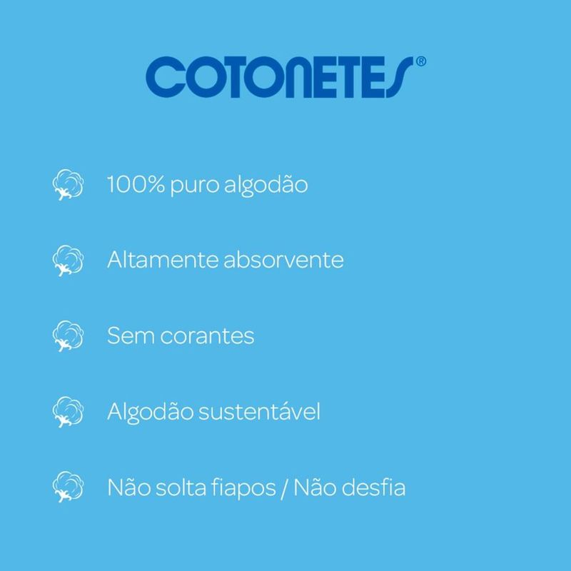COTONETES® é feito com algodão 100% puro e possui hastes plásticas flexíveis. Por isso oferece toda a suavidade, conforto e absorção para o cuidado da sua pele. COTONETES® é indicado para a higiene pessoal de toda a família. Pode ser usado para limpar delicadamente a parte externa da orelha (desde que não atinja o canal do ouvido), as dobrinhas do pescoço e pernas do bebê, além de ser recomendado para aplicar e remover maquiagem.