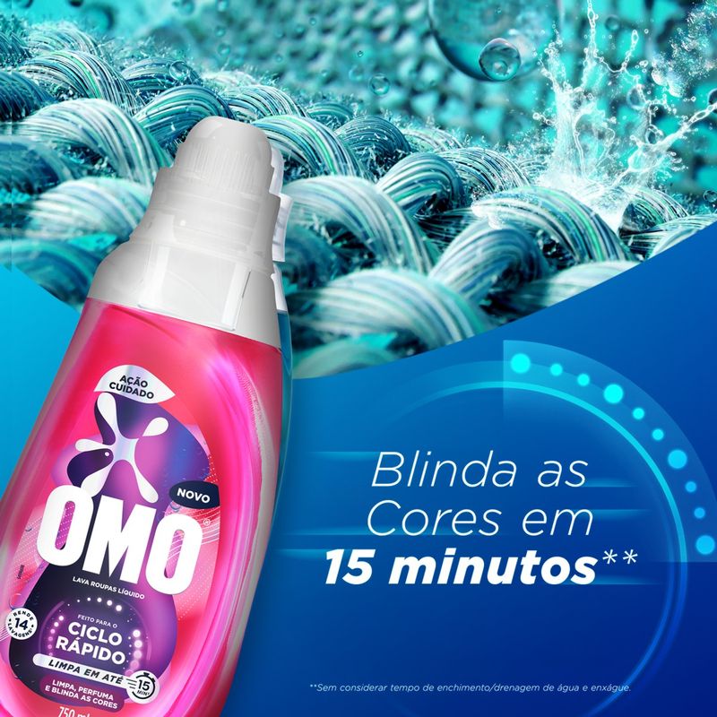 ? O Lava Roupas Líquido OMO Ação Cuidado garante limpeza impecável e perfumação intensiva das roupas mesmo em ciclos rápidos de até 15 minutos** ? Sua fórmula com poderosos agentes de limpeza, limpa, perfuma e blinda as cores de suas peças ? Este lava roupas líquido perfuma e limpa em profundidade sem agredir, não danifica os tecidos ? O detergente líquido OMO Ação Cuidado, garante roupas impecavelmente limpas, muito perfumadas e com cores vivas ? Além disso, esse lava roupas líquido é concentrado, menos de uma tampa basta para um ciclo rápido* ? A linha de Lava Roupas Líquido OMO Ciclo Rápido foi feita para limpar e perfumar no ciclo rápido Chegou o revolucionário Lava Roupas Líquido OMO Ação Cuidado para lavar suas roupas mesmo em ciclo rápido. Esse lava roupas líquido limpa de forma eficaz as sujeiras enquanto perfuma com sua fragrância intensa. Seu perfume proporciona a sensação de frescor de suas peças, e elimina as sujeiras em até 15 minutos** sem agredir e danificar os tecidos. A fórmula inovadora e poderosa do lava roupas líquido OMO Ação Cuidado, limpa, perfuma e blinda as cores. OMO lava roupas líquido é poderoso, 750 ml do produto rende 14 lavagens. Menos de uma tampa basta para um ciclo rápido*. Apesar deste lava roupas ter sido concebido para ciclo rápido, pode ser usado em qualquer tipo de ciclo, proporcionando poder de limpeza e fragrância duradoura. Experimente outros produtos da linha de Lava Roupas OMO feito para o ciclo rápido, como: Lava Roupas OMO Ação Antiodor e Lava Roupas OMO Ação Total, que limpam e perfumam no ciclo rápido. OMO, o rápido ficou ainda melhor. *Para nível de água extra baixo/baixo, utilize menos de uma tampa (50 ml). Para nível de água médio/alto, utilize uma tampa cheia (70 ml). A dosagem recomendada é para máquina de abertura superior (de 11 kg). Para outros tipos de máquina, ajuste a dosagem. **Sem considerar tempo de enchimento/drenagem de água e enxágue.