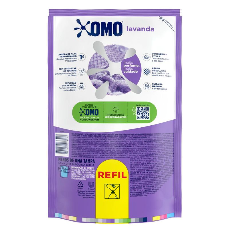 • O Sabão Líquido Refil OMO Lavanda é imbatível no perfume*, com cheirinho que dura muito e cuida do meio ambiente • A nova fórmula do lava-roupas OMO com explosão de lavanda, é perfeita para momentos de tranquilidade e relaxamento • Lava-roupas poderoso na remoção de manchas dos tecidos, e imbatível no perfume* de lavanda que dura até 14 dias • Este sabão em líquido Lavanda, além de perfumar por muito tempo, cuida também das suas roupas durante as lavagens, sem deixar resíduos. Desenvolvido para utilizar na máquina ou no tanque • O Sabão Líquido OMO refil econômico de 900 ml é poderoso na limpeza e rende 9 lavagens, apenas uma tampa lava uma máquina cheia** • Detergente líquido com ativos biodegradáveis e embalagem refil ecológica. sOMOs diferentes, somos transformação positiva para o meio ambiente O Sabão Líquido Refil OMO Lavanda foi desenvolvido com explosão de perfume, perfeito para momentos de tranquilidade e de relaxamento, seja em casa ou na lavanderia. A nova fórmula possui um perfume exclusivo de lavanda que dura 14 dias. Além de perfumar por muito tempo, cuida também das suas roupas durante as lavagens sem deixar resíduos. O detergente líquido foi desenvolvido para ser utilizado na máquina e no tanque. Este lava-roupas OMO Lavanda é poderoso na remoção das manchas, cuidando das cores e dos tecidos. Além de garantir limpeza e cuidar das roupas, este lava-roupas é imbatível no perfume*, deixando cheirinho que dura muito, e cuida do meio ambiente. O sabão líquido OMO é poderoso, 900 ml rende 9 lavagens. Sua fórmula contém ativos biodegradáveis, além de economizar água, uma vez que precisa de apenas 1 enxágue. Apenas uma tampa lava uma máquina cheia**. Quando você escolhe OMO, você escolhe um mundo melhor. Juntos, sOMOs a transformação positiva para o meio ambiente. Seu uso é recomendado por Brastemp e Consul. Acesse ao site e saiba como um futuro limpo é possível. *Comparado com detergentes líquidos do mesmo fabricante. **A dosagem recomendada é para máquina