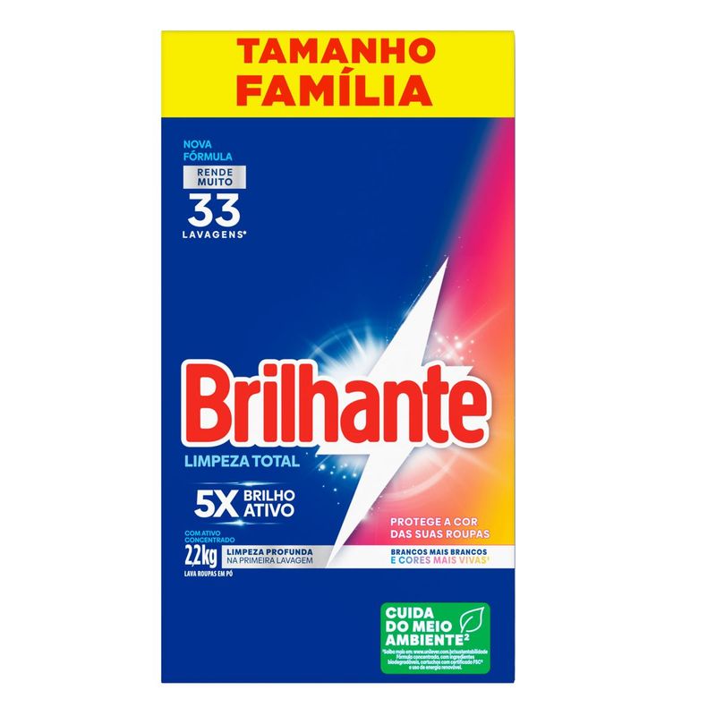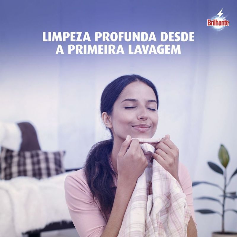 • O Sabão em Pó Brilhante Limpeza Total permite a blindagem das cores, deixando-as muito mais vivas e impactantes • Este detergente lava roupas em pó para tecidos e roupas possui a tecnologia Brilho Ativo, mantendo o colorido das roupas por muito mais tempo • Este lava-roupas em pó evita o amarelamento dos tecidos, deixando os brancos impecáveis • Brilhante Limpeza Total, com sua nova fórmula que além de higienizar suas roupas profundamente, as protege cuidando das cores • O Sabão em Pó Brilhante ajuda a prevenir sinais de desgaste, mantendo suas roupas novas por mais tempo* • Este detergente garante uma limpeza profunda desde a primeira lavagem A nova fórmula do Sabão em Pó Brilhante Limpeza Total combina os melhores resultados de limpeza com o cuidado dos tecidos: de um lado, o poder das enzimas, que proporciona uma limpeza profunda ao mesmo tempo que evita que a sujeira volte a se depositar nas roupas; do outro, a tecnologia Brilho Ativo que evita o amarelamento das roupas brancas e mantém os coloridos mais vivos. O Lava-Roupas em Pó Brilhante Limpeza Total limpa profundamente suas roupas sem agredir os tecidos, ajudando a prevenir os sinais de desgaste das suas peças preferidas após cada lavagem, além de permitir a blindagem das cores, deixando-as muito mais vivas e impactantes. Entre limpeza profunda e blindagem da cor? Escolha os dois! Com Brilhante, você sempre leva mais com a solução completa! Brilhante limpa as suas roupas brancas e coloridas enquanto cuida das cores. É um ativo concentrado poderoso. Brilhante quer se tornar um aliado nas tarefas diárias de seus consumidores e busca trazer praticidade com produtos inovadores e que todo mundo possa usar, diminuindo o peso das tarefas e liberando tempo para as demais atividades do dia a dia. Acesse o nosso website para saber mais. *Comparado à fórmula sem tecnologia de enzimas.