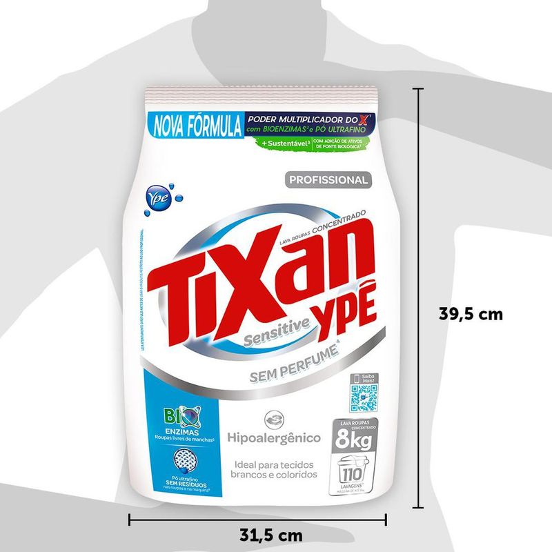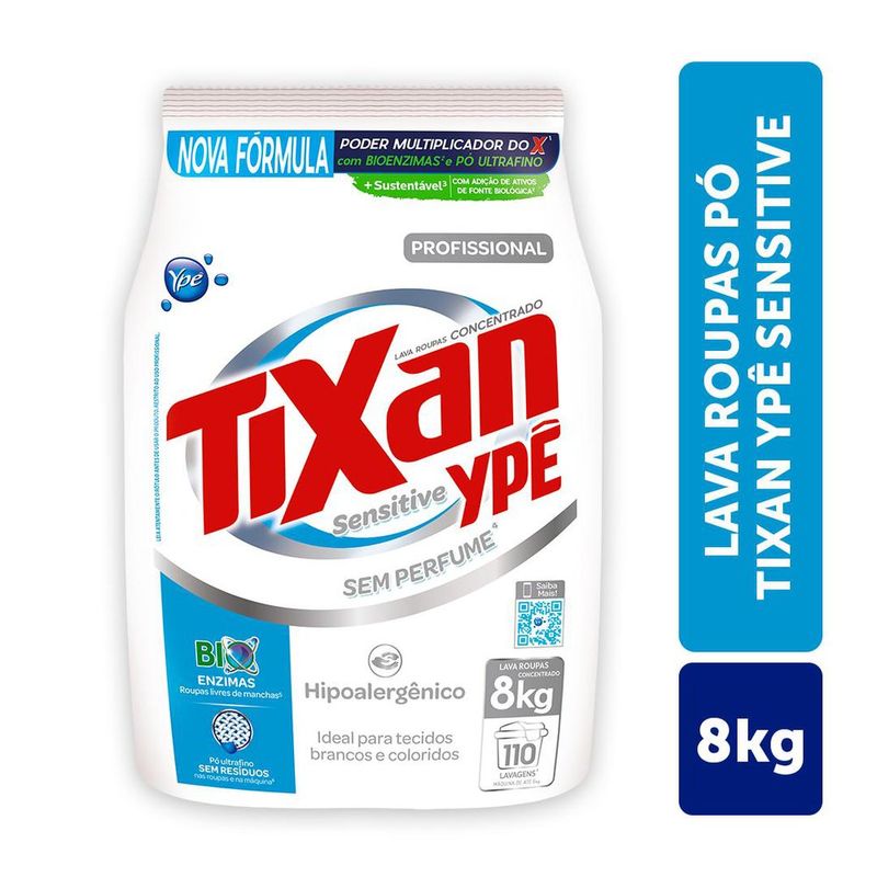 Lava Roupas Pó Tixan 8Kg Sensitive, Sem perfume; Performance e Eficiência; Remova as manchas e sujeiras mais difíceis; Hipoalergênico; Ideal para tecidos brancos e coloridos