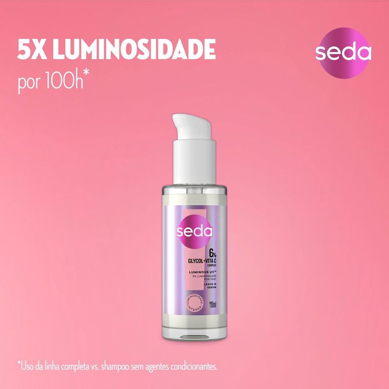 • Sérum Leave-In SEDA Luminous UV com 6% Glycol + Vita C Complex que repara os sinais de dano UV, proporcionando 5x mais luminosidade por até 100 horas*. • Proteção térmica de até 230°C que protege os fios contra danos causados pelo calor de secadores e chapinhas, mantendo o cabelo saudável e brilhante. • Fórmula ultraleve de rápida absorção, ideal para uso diário, que não pesa nos fios e deixa o cabelo solto, macio e com movimento natural. • Sela as cutículas e ativa a luminosidade natural dos fios, deixando o cabelo com uma aparência saudável e revitalizada. • Cabelos protegidos e iluminados por mais tempo com a linha completa SEDA Luminous UV, que oferece brilho excepcional e cabelos radiantes. • Modo de uso prático: aplique o creme de cabelo no comprimento e nas pontas secas ou molhadas, sem necessidade de enxágue, para uma luminosidade intensa e duradoura. O Sérum Leave-In SEDA Luminous UV é a escolha ideal para quem deseja cabelos brilhantes, saudáveis e protegidos dos danos causados pelos raios UV e pelo calor de ferramentas térmicas. Formulado com 6% Glycol + Vita C Complex, este sérum inovador repara os sinais de danos UV, proporcionando até 5x mais luminosidade por até 100 horas*. Com proteção térmica de até 230°C, o Sérum Leave In SEDA Luminoso protege seus fios contra os danos causados por secadores, chapinhas e babyliss, mantendo o cabelo saudável e cheio de vida. Este é um daqueles produtos de cabelo que possui fórmula ultraleve e de rápida absorção ideal para uso diário, pois não pesa nos fios, deixando o cabelo solto, macio e com movimento natural. Além de reparar os danos, este sérum também sela as cutículas e ativa a luminosidade natural dos fios, garantindo uma aparência saudável e revitalizada, mesmo em condições de exposição ao sol. O resultado são cabelos protegidos, iluminados e com um brilho excepcional. Para facilitar o uso, o Sérum Leave In SEDA Luminous UV não precisa ser enxaguado. Basta aplicar no comprimento e nas pontas dos cab