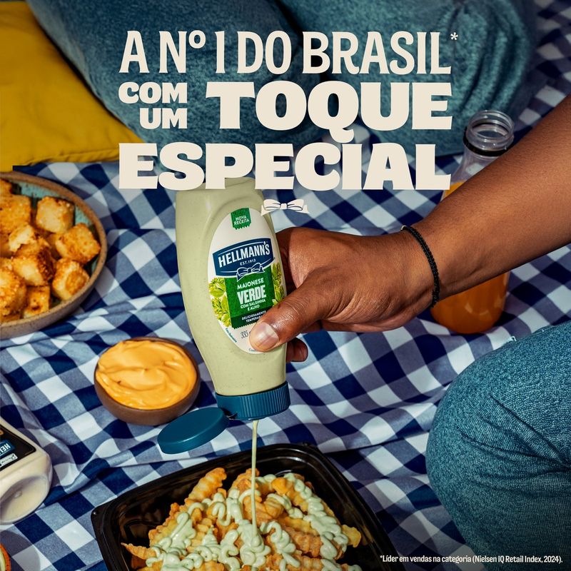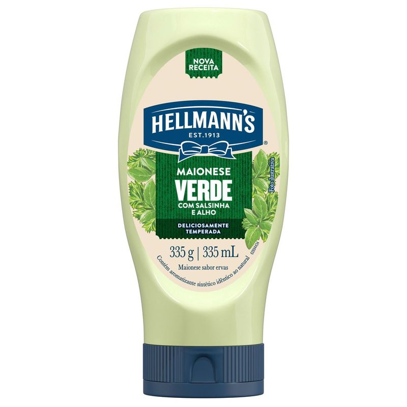 • Maionese Hellmann's Verde 335g: sabor cremoso e marcante, com toque especial de salsinha e alho para realçar qualquer prato. • Embalagem bisnaga moderna e prática para dosar na medida certa, sem desperdício. • Sem glúten em seus ingredientes. • Frascos 100% recicláveis e feitos a partir de materiais reciclados, ajudando a cuidar do planeta enquanto leva mais sabor para a sua mesa. • Textura cremosa ideal para petiscos, acompanhamentos, hambúrgueres, wraps, saladas, batatas fritas e molhos caseiros. A Maionese Hellmann's Verde 335g une a cremosidade e o sabor irresistível da maionese tradicional ao toque especial de salsinha e alho. Com textura cremosa e sabor marcante, é perfeita para realçar o sabor de acompanhamentos, petiscos, lanches, saladas, molhos e pratos do dia a dia. Sem glúten, é feita com ingredientes cuidadosamente selecionados para garantir qualidade e sabor em cada porção. A embalagem bisnaga moderna e prática permite dosar na medida certa, evitando desperdício e facilitando o uso no dia a dia. Com frascos 100% recicláveis, Hellmann's Verde ajuda você a cuidar do planeta enquanto leva mais sabor para a sua mesa. É a escolha ideal para transformar ingredientes simples em refeições deliciosas, dando aquele toque especial que só Hellmann's oferece. Hellmann’s Verde. O sabor irresistível da verdadeira maionese com o toque de salsinha e alho.