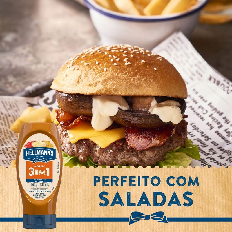 • O Molho 3 em 1 Delicioso Mix Hellmann's é a mistura perfeita de maionese, ketchup e mostarda • Esse Molho 3 em 1 é perfeito para dar um toque especial aos seus sanduíches e refeições • Os seus três molhos para churrasco preferidos misturados perfeitamente em um único produto • Com o Molho 3 em 1 Hellmann's você não precisa mais fazer a misturinha de maionese, ketchup e mostarda em casa • Cada frasco do Molho 3 em 1 Delicioso Mix Hellmann's é 100% reciclado de outras embalagens • Sem ideias do que fazer com os ingredientes que serão desperdiçados? Não os desperdice. Com Hellmann's tudo fica com mais sabor. Veja as nossas receitas! O molho Hellmann's 3 em 1 é a mistura perfeita de maionese, ketchup e mostarda com toda a qualidade Hellmann's que você já conhece. Hellmann's se inspirou na misturinha que muitos já faziam em casa e desenvolveu um produto muito prático que, além de ser delicioso, ainda é super econômico, afinal, você leva apenas um produto com seus três molhos preferidos juntos. Com o Molho 3 em 1 Delicioso Mix Hellmann's você pode dar aquele toque especial para seus lanches, sanduíches, hambúrgueres, batata frita, como molho para churrasco, hot dog ou colocar o seu lado cozinheiro em ação e caprichar naquela receita mais elaborada. O Molho 3 em 1 Hellmann's é cremoso, tem 19 kcal por colher de sopa (12 g) e é feito somente com ingredientes de qualidade, dando aquele sabor delicioso que só Hellmann's proporciona. Cada frasco é feito de plástico reciclado de outras embalagens. Ajude esse ciclo a continuar; recicle! Mais sabor, menos desperdício. A comida é importante demais para ser desperdiçada, por isso na Hellmann’s investimos na versatilidade de nossos produtos. Isso permite que você transforme os ingredientes que tem em casa em verdadeiras e deliciosas refeições. Inspire-se com as nossas receitas. Com o Molho 3 em 1 da Hellmann's nada se desperdiça, tudo se aproveita. Experimente você também! Mais que sabor, sabor Hellmann's!