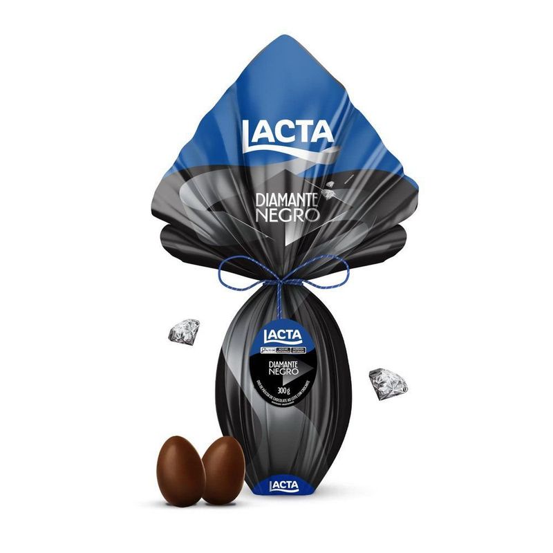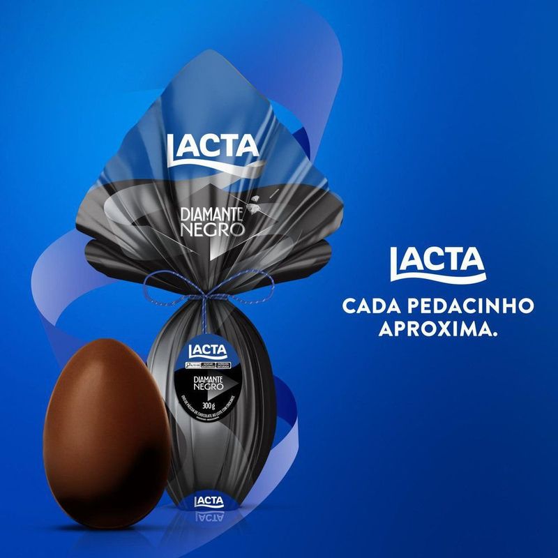 O icônico e inconfundível Diamante Negro traz a combinação perfeita entre chocolate ao leite Lacta e pedacinhos crocantes de açúcar e castanha. Seu crocante é bem fininho e quebra com facilidade durante a mordida. É ele quem dá a textura única pra sua Páscoa.