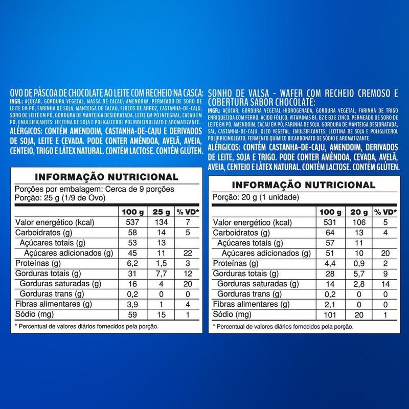 Compre agora o Ovo de Páscoa Lacta Sonho de Valsa 277g. É a combinação perfeita de um recheio cremoso de amendoim e castanha de caju, com a crocância do wafer e sua deliciosa camada sabor chocolate. Perfeito para aproveitar com toda a família, ou para presentear parentes e amigos. Compre já! Embalagem individual 277g. Tabela Nutricional e Alergênicos: Veja a tabela nutricional e ingredientes nas imagens. Produto com Alto Teor de Açúcar Adicionado e Gordura Saturada.