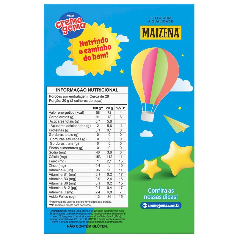 • Maizena Cremogema Tradicional é fonte de 9 nutrientes que ajudam na imunidade, como Ferro, Zinco e Vitaminas A, C e do Complexo B, e com o delicioso sabor tradicional de baunilha que todos adoram • Maizena Cremogema Tradicional é muito versátil para cozinhar refeições para as crianças, você pode preparar várias receitas de mingau, pavê, creminho de baunilha e muito mais • Cremogema tem aquele gostinho de infância, que faz lembrar muitas memórias da época de criança • Maizena Cremogema Tradicional não contém glúten • Cremogema Tradicional não contém corantes artificiais • Além da nutrição que enche a barriguinha dos pequenos, Cremogema representa todo o cuidado e carinho que aquece o coração Maizena Cremogema Tradicional é fonte de 9 vitaminas e minerais, como Ferro, Zinco e Vitaminas A, C e do Complexo B. Nutrientes que além de essenciais na nutrição, auxiliam na imunidade do seu pequeno. Além disso, não contém glúten e corantes artificiais, para uma alimentação mais saudável! Somado a todas as vitaminas e minerais que auxiliam na nutrição do seu pequeno, um pratinho de Cremogema Tradicional deixa seus filhos de barriguinha cheia, fazendo com que tenham energia e disposição para o dia a dia! Com Cremogema Tradicional você pode preparar diversos pratos deliciosos para o pequeno, desde receitas de mingau de cremoso de Cremogema para o bebê, pavê de sobremesa, creminho de baunilha e muitas outras opções deliciosas. O preparo do pratinho dos pequenos envolve todo um carinho e amor, desde o momento que levamos ao fogo, até aquele toque final que só você sabe fazer do jeitinho que eles mais gostam! Cremogema é a tradição que passa de geração em geração. É um complemento alimentar com gostinho de infância. Por isso, além de todo o cuidado no preparo dos nossos produtos, Cremogema tem a missão de ajudar as mamães a educarem seus filhos a sempre seguirem o Caminho do Bem!