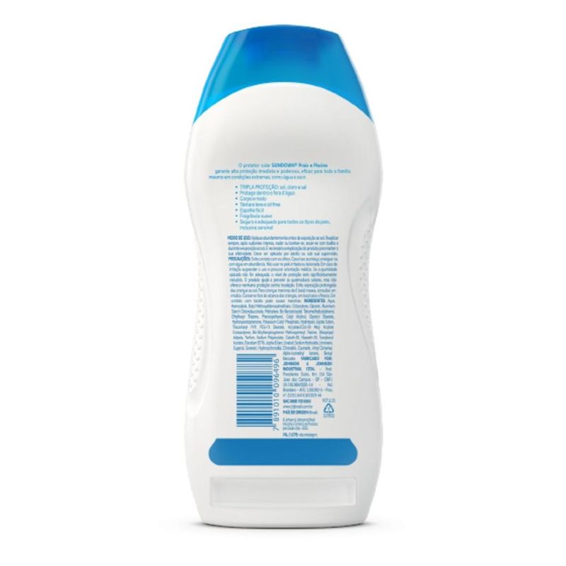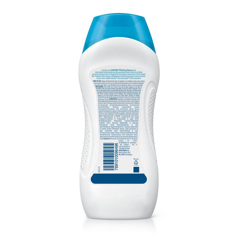 O que é e para que serve? O Protetor Solar Corpo e Rosto SUNDOWN® Praia e Piscina FPS 30, 200mL conta com tripla proteção e ajuda a proteger a pele (corpo e rosto) de elementos agressores como o sol, cloro e a água salgada do mar. Com nova textura mais leve e não pegajosa, oferece proteção imediata UVA + UVB, protegendo a pele de queimaduras solares dentro e fora d'água. É duas vezes mais resistente à água e ao suor e seguro para uso em toda família. Proteção completa para curtir a vida ao ar livre; UVA + UVB balanceado; resistente à água por 2 horas; hidratação prolongada; fotoestável: mesma proteção durante todo o tempo de exposição ao sol. Benefícios e diferenciais Nova textura: mais leve e não pegajosa; Tripla proteção ajuda a proteger a pele de elementos agressores como o sol, cloro e a água salgada do mar; Proteção imediata UVA/UVB; Para corpo e rosto (oil free e não comedogênico); Hidratação prolongada; 2x mais resistente à água e ao suor; Fotoestável: mesma proteção durante todo o tempo de exposição ao sol; Como usar Aplique abundantemente antes da exposição ao sol. Reaplicar sempre, após sudorese intensa, nadar ou banhar-se, secar-se com toalha e durante a exposição ao sol. É necessária a reaplicação do produto para manter a sua efetividade. Deve ser aplicado por adulto ou sob sua supervisão. Composição Aqua, Homosalate, Butyl Methoxydibenzoylmethane, Octocrylene, Glycerin, Aluminum Starch Octenylsuccinate, Methylene Bis-Benzotriazolyl Tetramethylbutylphenol, Ethylhexyl Triazone, Phenoxyethanol, Cetyl Alcohol, Glyceryl Stearate, Hydroxyacetophenone, Potassium Cetyl Phosphate, Hydrolyzed Jojoba Esters, Triacontanyl PVP, PEG-75 Stearate, Acrylates/C10-30 Alkyl Acrylate Crosspolymer, Bis-Ethylhexyloxyphenol Methoxyphenyl Triazine, Diisopropyl Adipate, Parfum, Sodium Polyacrylate, Ceteth-20, Steareth-20, Tocopheryl Acetate, Disodium EDTA, Jojoba Esters, Linalool, Sodium Hydroxide, Limonene, Eugenol, Geraniol, Hydroxycitronellal, Citrone