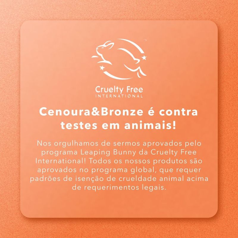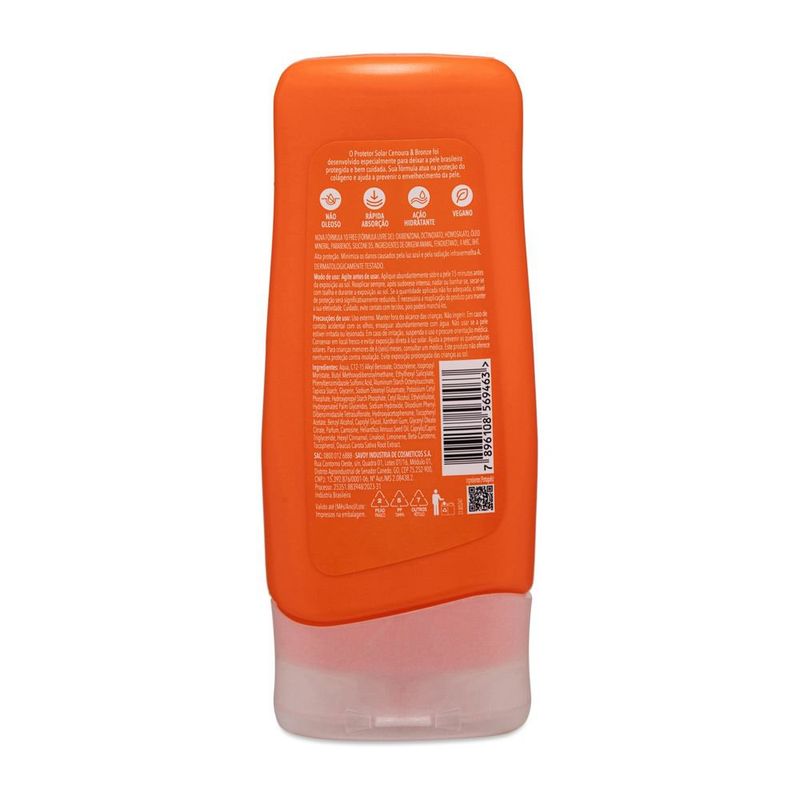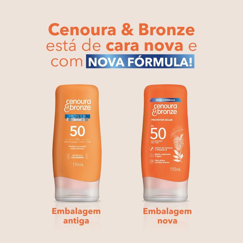 O Protetor Solar Cenoura e Bronze 50 FPS maximiza a proteção na sua pele, criando uma camada contra o sol onde for aplicado. Com tecnologia inovadora, ele também preserva o colágeno natural da pele, minimizando os danos mais profundos. Sua fórmula, resistente à água, contém ativos de Cenoura e Vitaminas E, que previnem o envelhecimento da pele. Produto testado dermatologicamente.