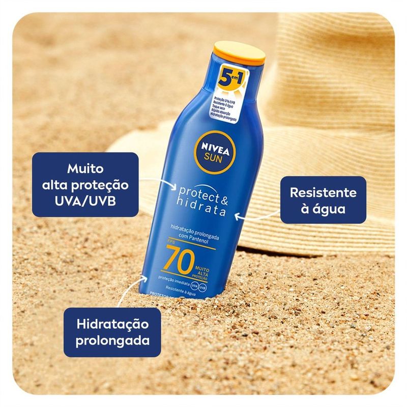 O que é? Protetor solar com hidratante que oferece altíssima proteção ao sol. Toque seco de rápida absorção. Garanta o seu! Para que serve o Protetor Solar Nivea Protect & Hidrata? Não deixa a pele oleosa, com sua fórmula oil free o protetor solar é rapidamente absorvido pelo corpo. Enriquecido com Panthenol, hidrata e protege por mais tempo. Benefícios e diferenciais - FPS70 garante muito alta proteção solar - Resistente à água - Previne o envelhecimento da pele Como usar o Protetor Solar Nivea Protect & Hidrata? Aplique uma boa quantidade na pele seca, 15 minutos antes de sair ao sol. Reaplique o produto a cada 2hrs ou depois de transpiração excessiva ou mergulho na água. Uma unidade de embalagem contém 200ml