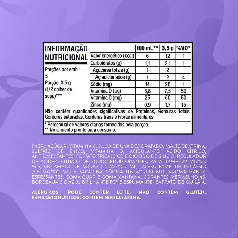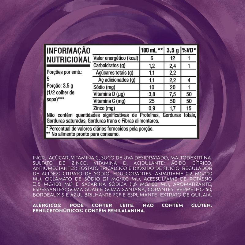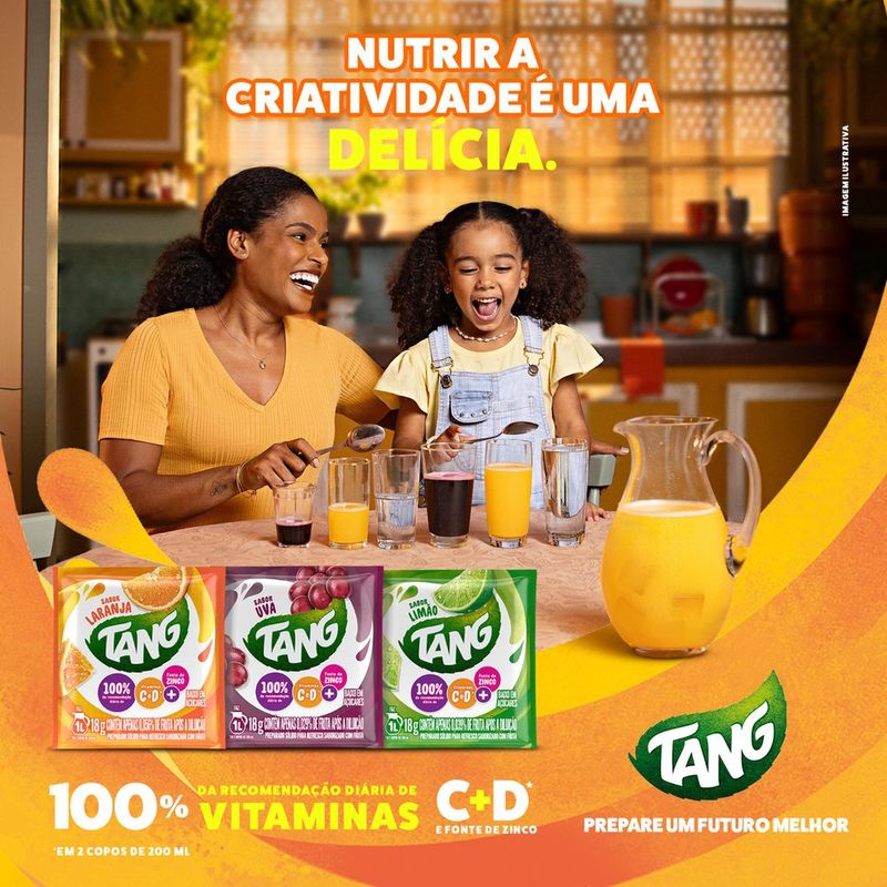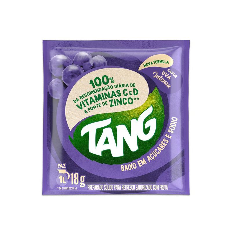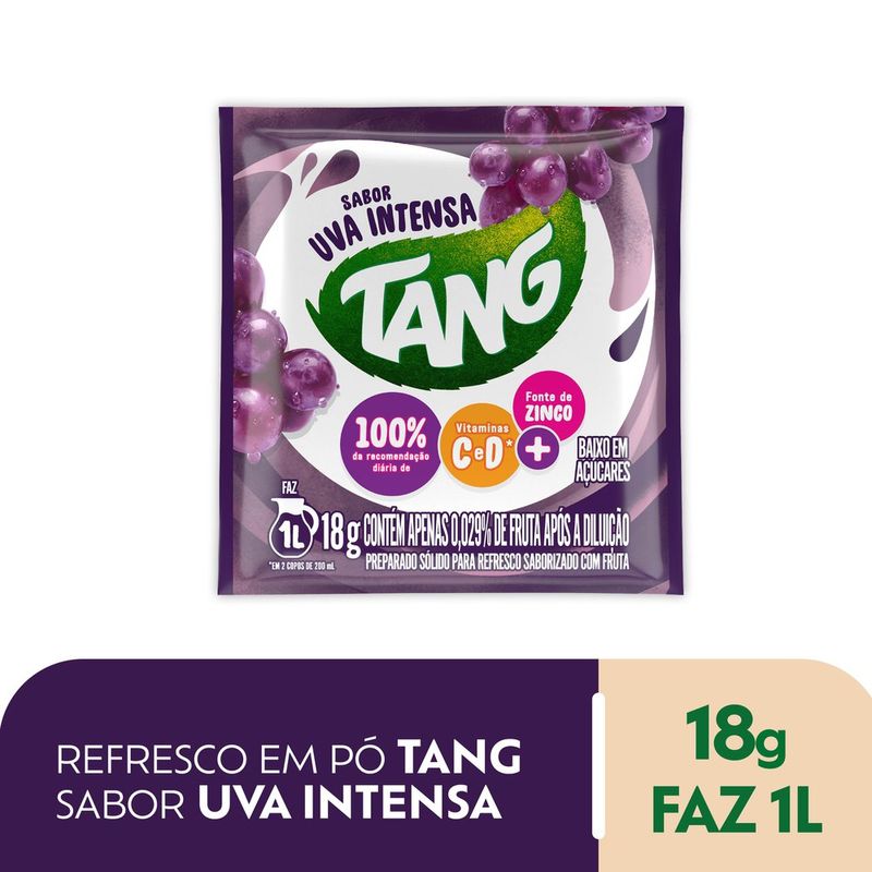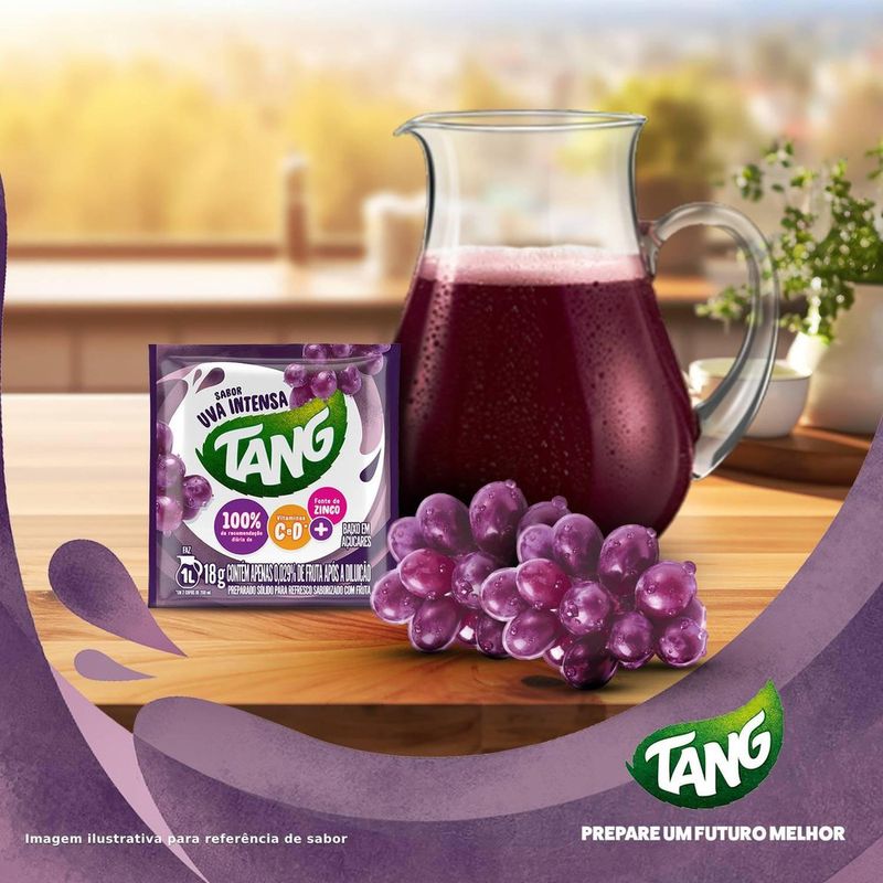 Compre agora o Refresco em pó Tang sabor Uva Intensa. O novo Tang tem 100% da recomendação diária de vitamina C e D em 2 copos de 200ml e é fonte de zinco. Mais sabor e nutrientes! Faz 1 Litro para você e a família aproveitarem! Compre já! Tabela Nutricional e Alergênicos: Veja a tabela nutricional e ingredientes nas imagens