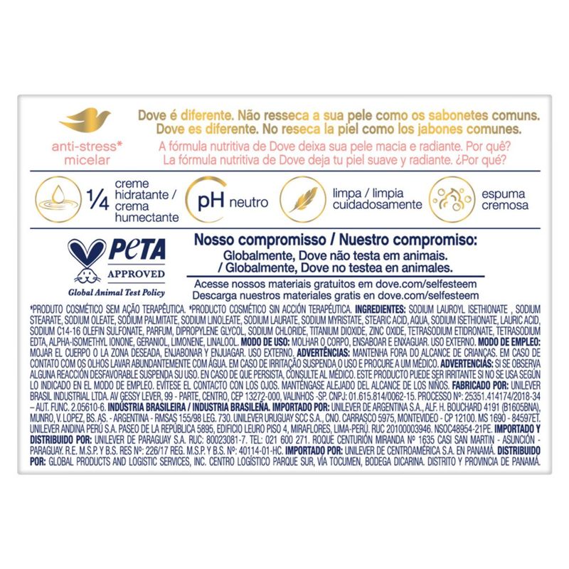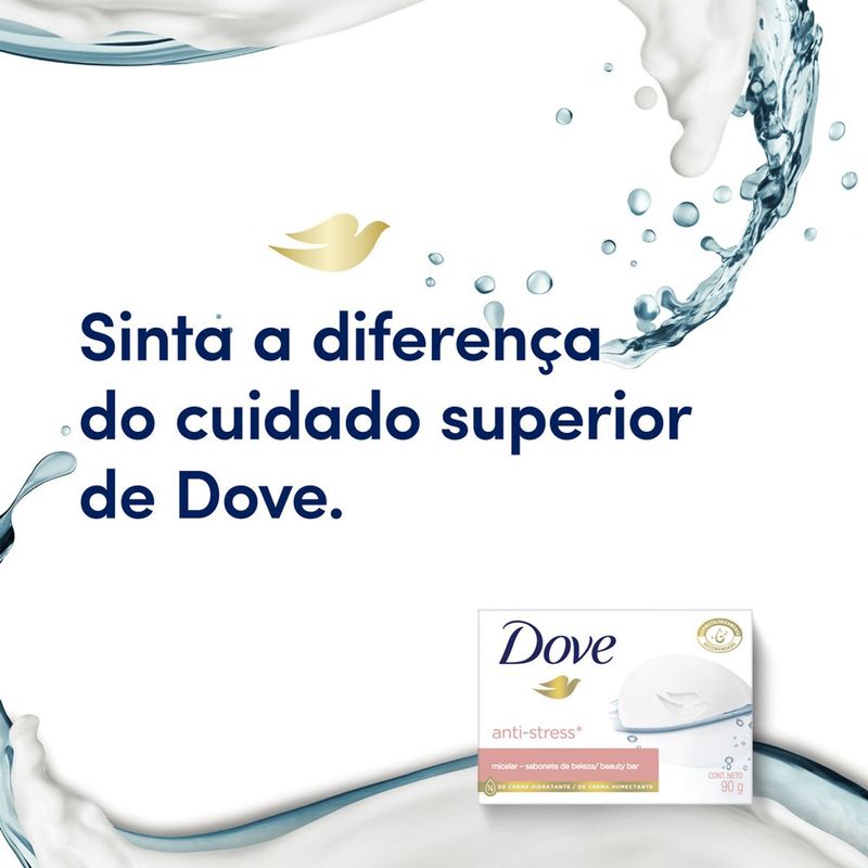 • O Sabonete em Barra Dove Anti-Stress Micelar combina o poder de limpeza micelar com 1/4 de creme hidratante na sua fórmula • Durante a limpeza, pequenas partículas se formam em volta das sujeiras e impurezas causadas pelos fatores estressantes ambientais diários, eliminando-as e deixando sua pele limpa e mais macia • Este sabonete em barra não resseca a pele como sabonetes comuns e ajuda a repor nutrientes naturais que podem ser perdidos durante o banho • O sabonete em barra hidratante Dove Anti-Stress Micelar possui ingredientes que deixam a pele macia, bem cuidada e com aspecto saudável • O Sabonete em Barra Dove Anti-Stress Micelar pode ser usado diariamente no rosto, mãos e corpo • Sabão em barra com tecnologia de limpeza e manutenção da hidratação com suavidade para sua pele Dove não é um simples sabonete em barra comum. É um sabonete de beleza feito com tecnologia Syndet que vai além da limpeza, nutrindo a pele conforme remove a sujeira do dia a dia. O segredo para uma pele bonita é a hidratação diária, e nenhum sabonete em barra comum hidrata melhor do que Dove. O Sabonete Dove Anti-Stress Micelar combina uma fórmula de limpeza suave com 1/4 de creme hidratante, deixando a sua pele macia, bem cuidada e com a aparência saudável. Durante a limpeza, pequenas partículas chamadas micelas se formam em volta das sujeiras e impurezas causadas pelos fatores estressantes ambientais diários. Essas partículas limpam gentilmente a pele deixando-a mais macia e suave. O Sabonete Dove não retira a hidratação natural da sua pele como os sabonetes em barra comuns: sua composição com 1/4 de creme hidratante ajuda a repor os nutrientes da pele deixando-a mais bem nutrida e hidratada. O Sabonete em Barra Dove Anti-Stress Micelar pode ser usado diariamente no rosto, mãos e corpo. Para uma melhor experiência no banho, sugerimos o seguinte modo de uso: primeiro, molhe as mãos e passe o Sabonete Hidratante Dove até formar uma espuma. Em seguida, massageie a espuma pelo seu