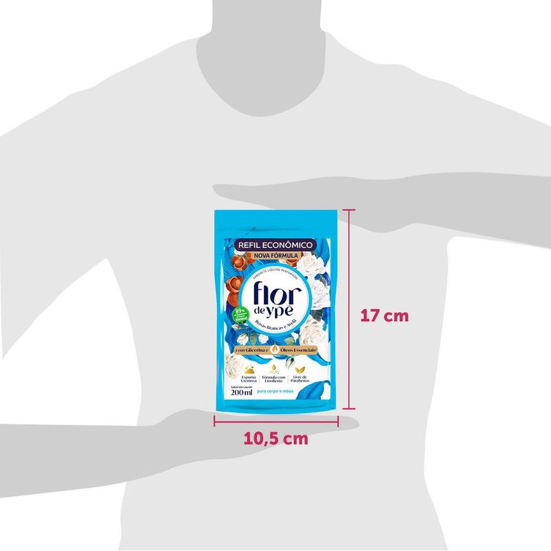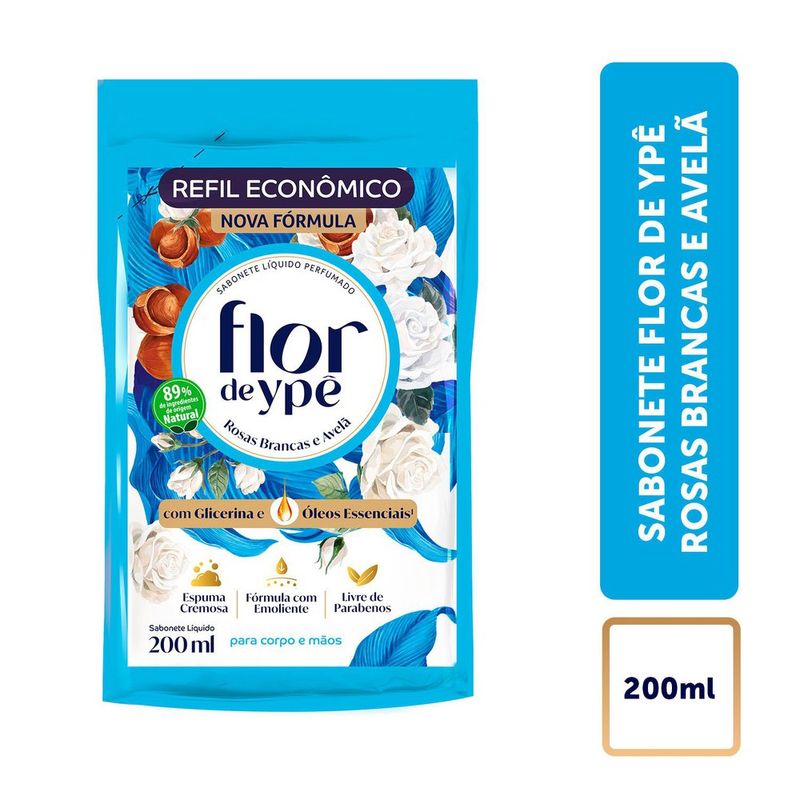 Sabonete Liquido Flor Ypê Rosas Brancas e Avelã Refil 200ml, Disponível em 5 versões: Rosas Brancas e Avelã; Flor de Maçã e Framboesa; Flor de Laranjeira e Damasco; Frésia e Pêssego; Água de Coco e Alecrim Com óleos essenciais e glicerina; Espuma cremosa e fórmula com emolientes, que contribuem para a proteção da pele Para corpo e mãos Testado dermatologicamente Livre de parabenos