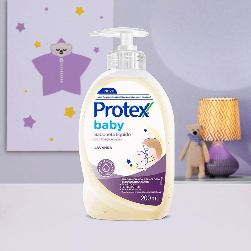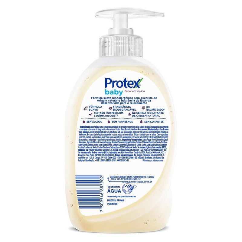 Sabonete líquido para bebê com glicerina de origem natural e fragrância de Lavanda desenvolvida para o relaxamentoEssa linha de sabonete líquido da cabeça aos pés de Protex Baby é hipoalergênico e tem glicerina de origem natural, que ajuda a hidratar a pele do seu(ua) pequeno(a) naturalmente.Tem mais: a glicerina também mantém a barreira protetora da pele dos bebês para que ela fique saudável e macia.E sua fórmula suave é sem álcool, sem corantes e sem parabenos. 3São produtos criados especialmente para momentos inesquecíveis, como o banho em bebê recém-nascido.Benefícios:¿¿ Protex Baby é enriquecido com glicerina de origem natural¿¿ Tem a Fragrância Relaxante¿¿ Fórmula Hipoalergênica¿¿ Protex Baby é enriquecido com glicerina de origem natural¿¿ Livre de álcool, conservantes e parabenos¿¿ Sem lágrimas¿¿ Testada por pediatra e dermatologista